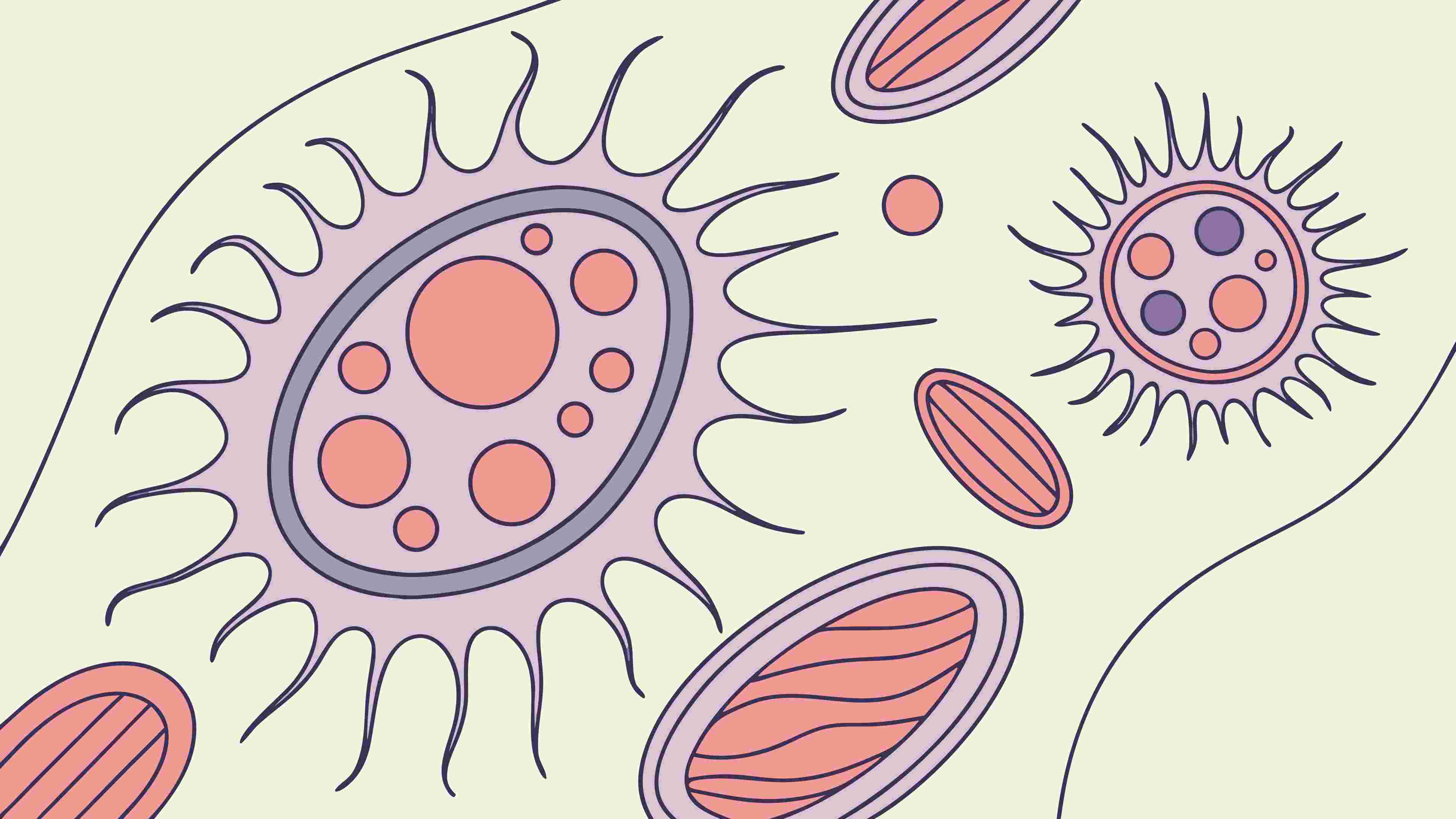 An intriguing abstract vector illustration depicting various microorganisms or cells, with visible nuclei and organelles. Ideal for biology, healthcare, science, or research themes, symbolizing microscopic life and fundamental biology, vector design Generative AI.