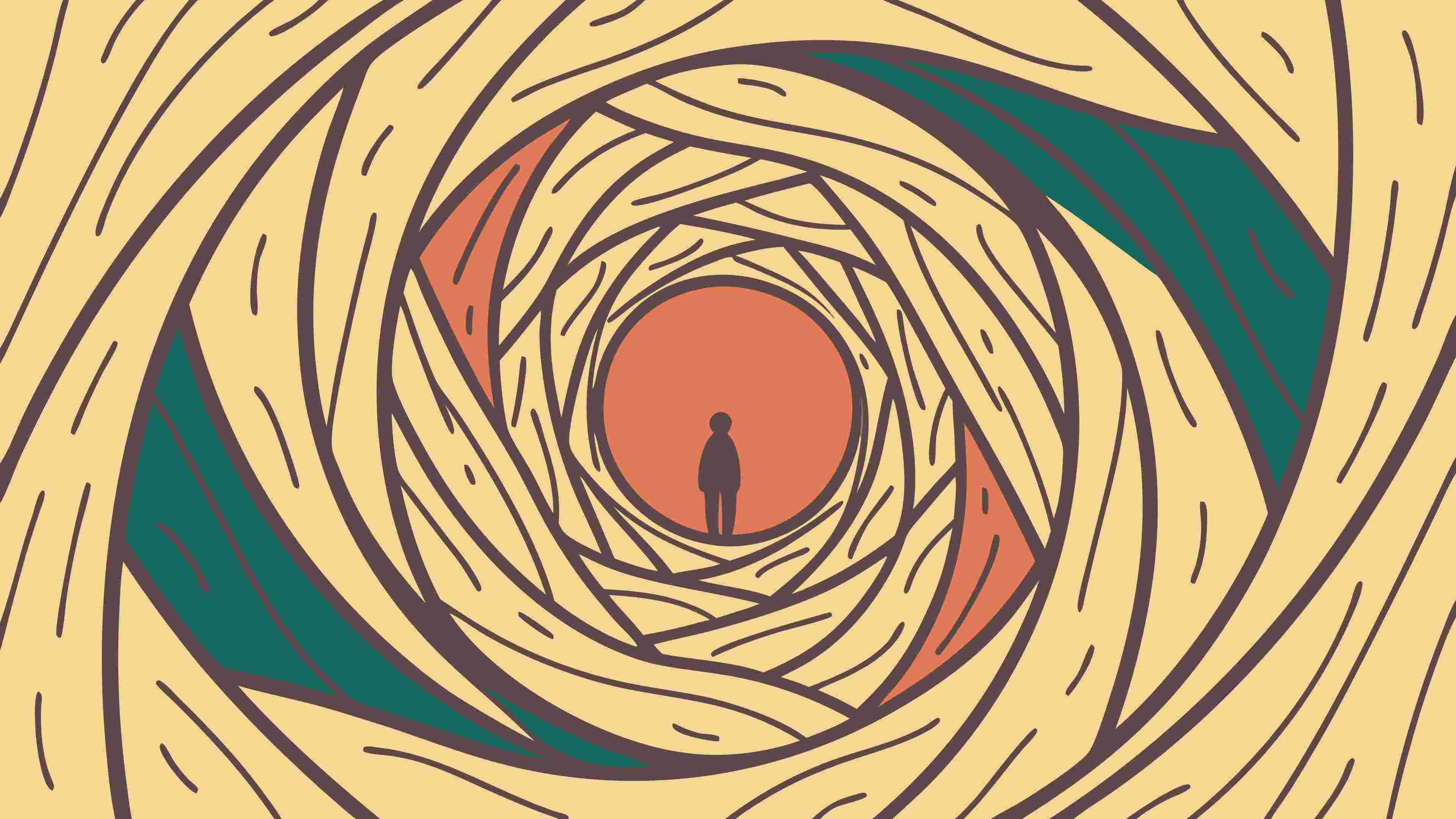 An intriguing vector illustration of an abstract spiral tunnel with a small human figure at its center, creating a unique perspective. Ideal for introspective themes, digital art, philosophical concepts, or spiritual journeys, symbolizing discovery and destiny, vector design Generative AI