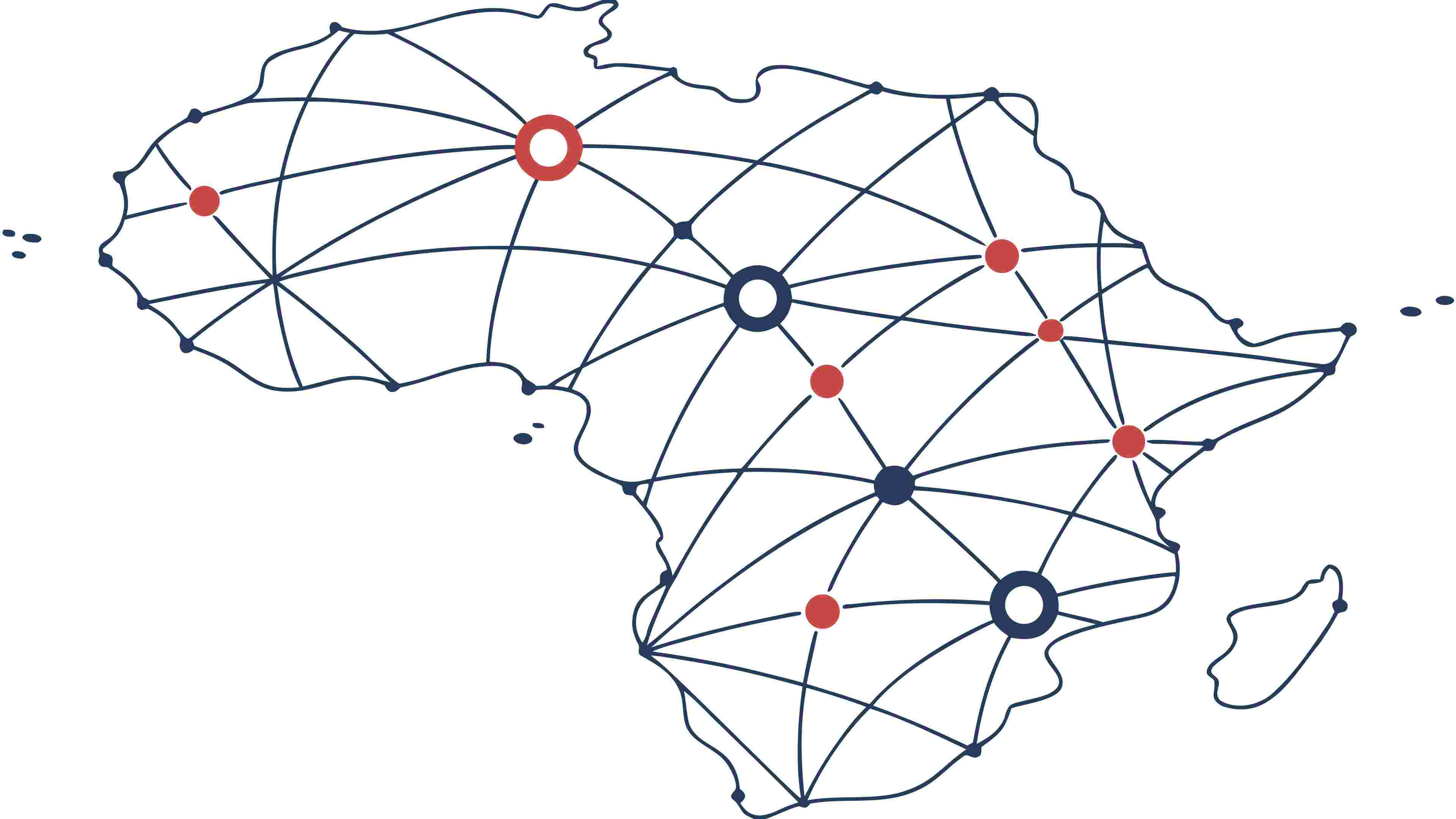 An illustration of the African continent map overlaid with a network of connected nodes and lines, featuring two stylized people interacting. This graphic symbolizes global communication, technological development, and social connectivity across Africa, vector design Generative AI
