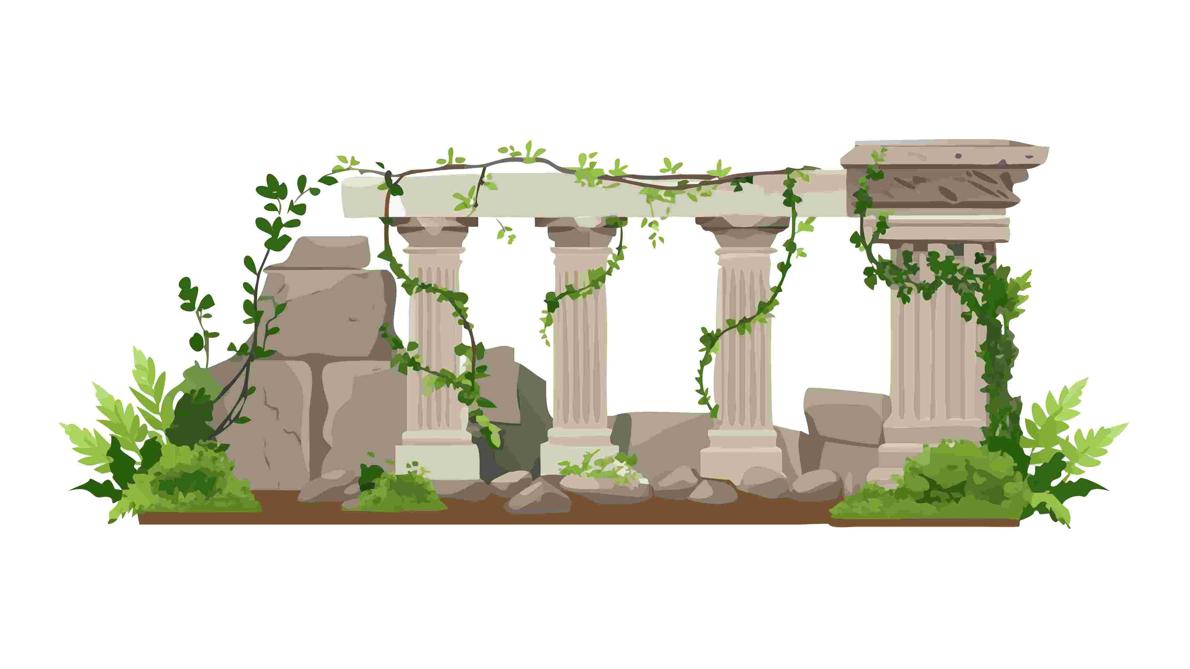 An evocative vector illustration of ancient stone arch ruins overgrown with lush greenery, forming a serene border. Perfect for historical themes, garden landscapes, fantasy settings, or travel brochures, symbolizing decay and rebirth, vector design Generative AI