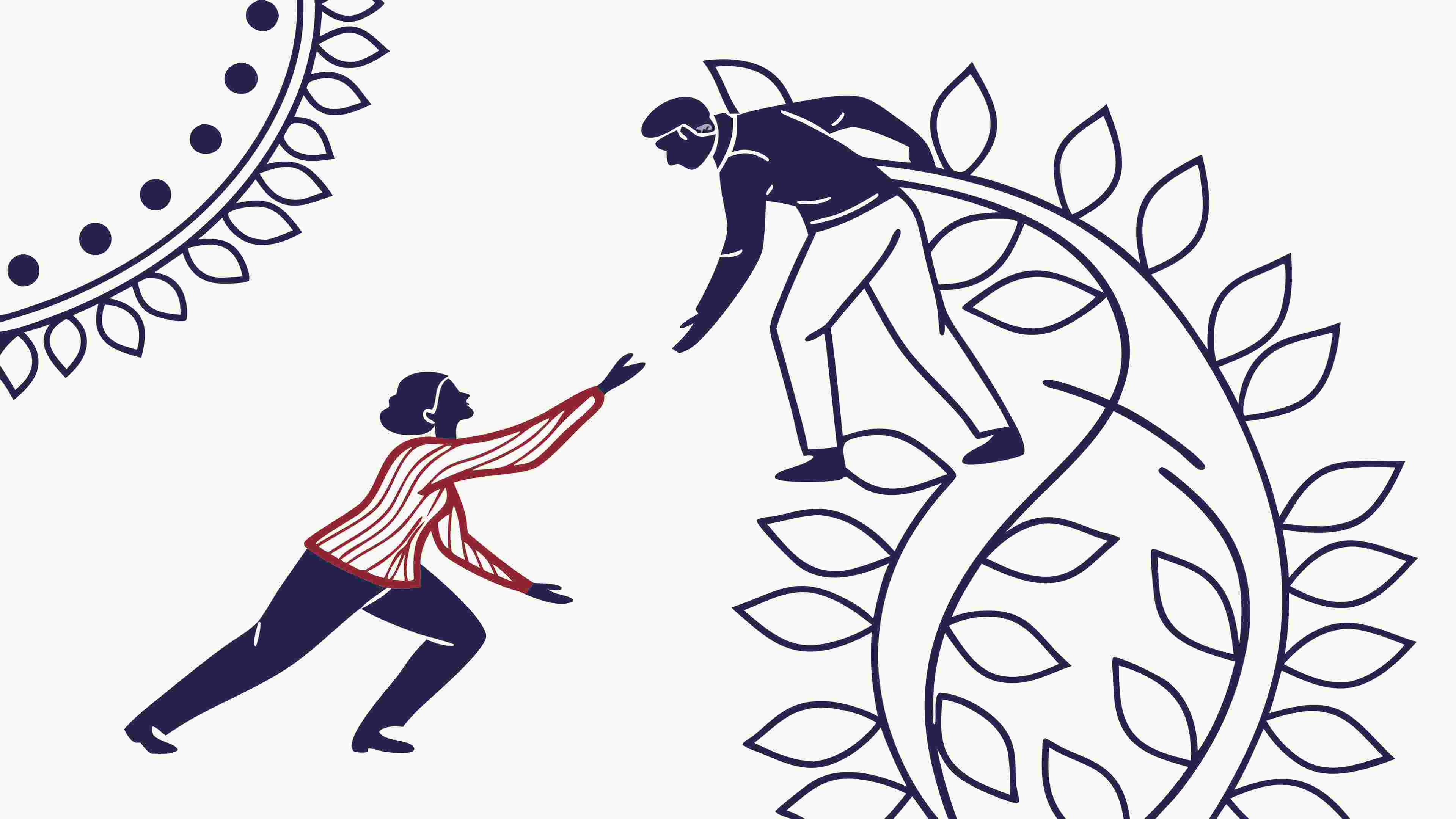 A conceptual vector illustration depicting two figures collaborating to support a growing leafy vine, symbolizing teamwork, growth, and nurturing. This uplifting graphic is ideal for business development, environmental initiatives, or social support themes, vector design Generative AI