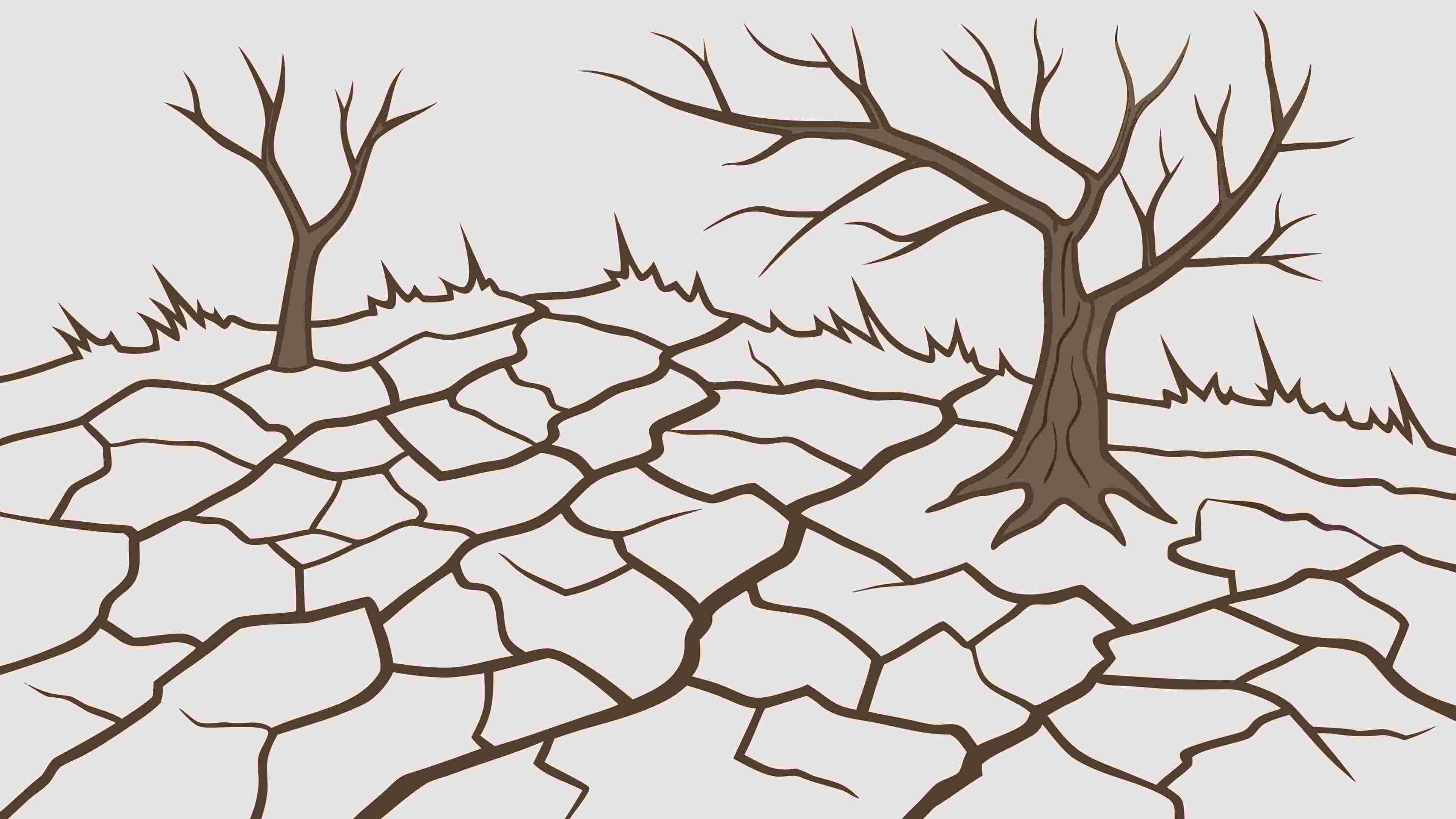 A stark vector illustration of a cracked earth landscape, featuring a lone bare tree, symbolizing desertification and environmental degradation. This poignant image is perfect for ecological themes, climate change awareness, or dramatic backgrounds, vector design Generative AI