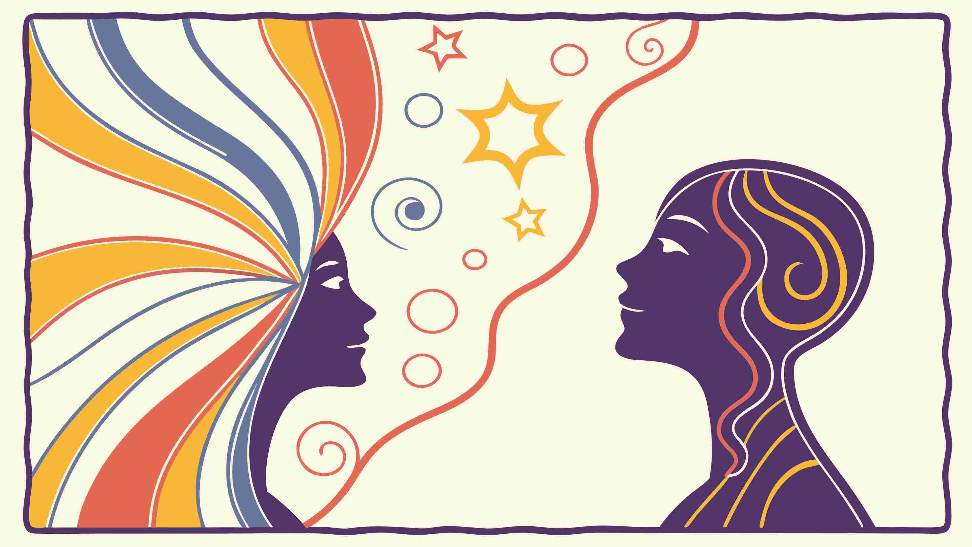 A compelling vector illustration portraying two human profiles, one radiating colorful streams of ideas to another, symbolizing creative mind, expanding thought, and knowledge sharing. This insightful graphic is ideal for education, innovation, or communication themes, vector design Generative AI
