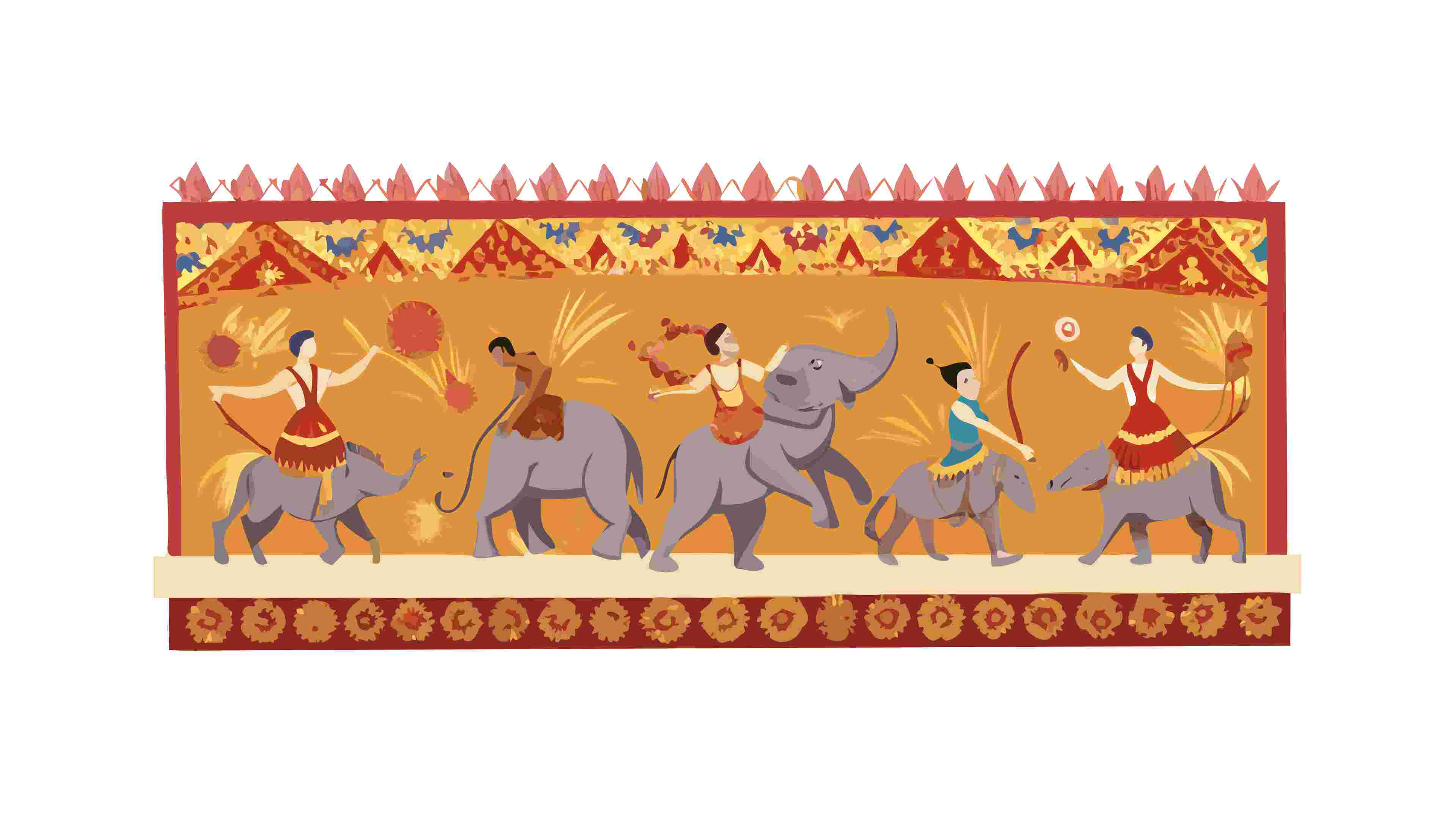 A vibrant vector border featuring a charming parade of decorated elephants against a backdrop of traditional patterns. This design is perfect for cultural events, festive celebrations, children's themes, or any project requiring a touch of exotic charm. The rich colors and intricate details make it an eye-catching element for banners, invitations, or decorative backgrounds, vector design Generative AI.