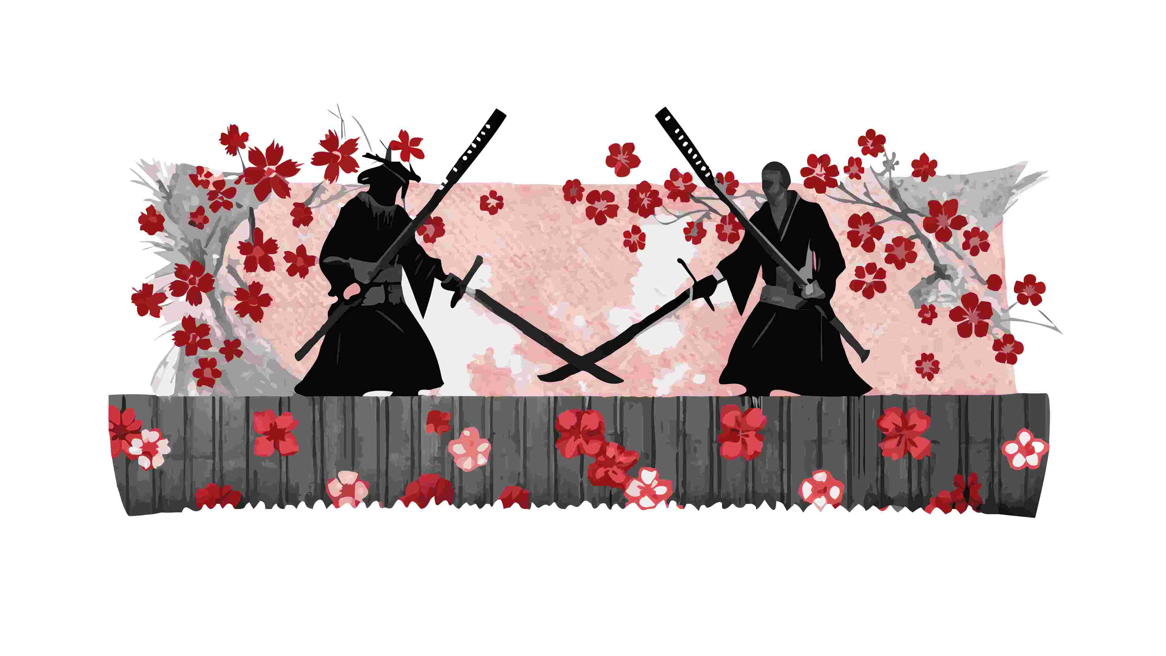 A powerful vector illustration depicting a dynamic battle scene featuring samurai warriors in traditional Japanese art style, surrounded by cherry blossoms. This action-packed design is perfect for martial arts themes, historical dramas, gaming concepts, or cultural presentations on feudal Japan. It captures the discipline, honor, and intensity of samurai combat, adding a striking and authentic visual, vector design Generative AI.