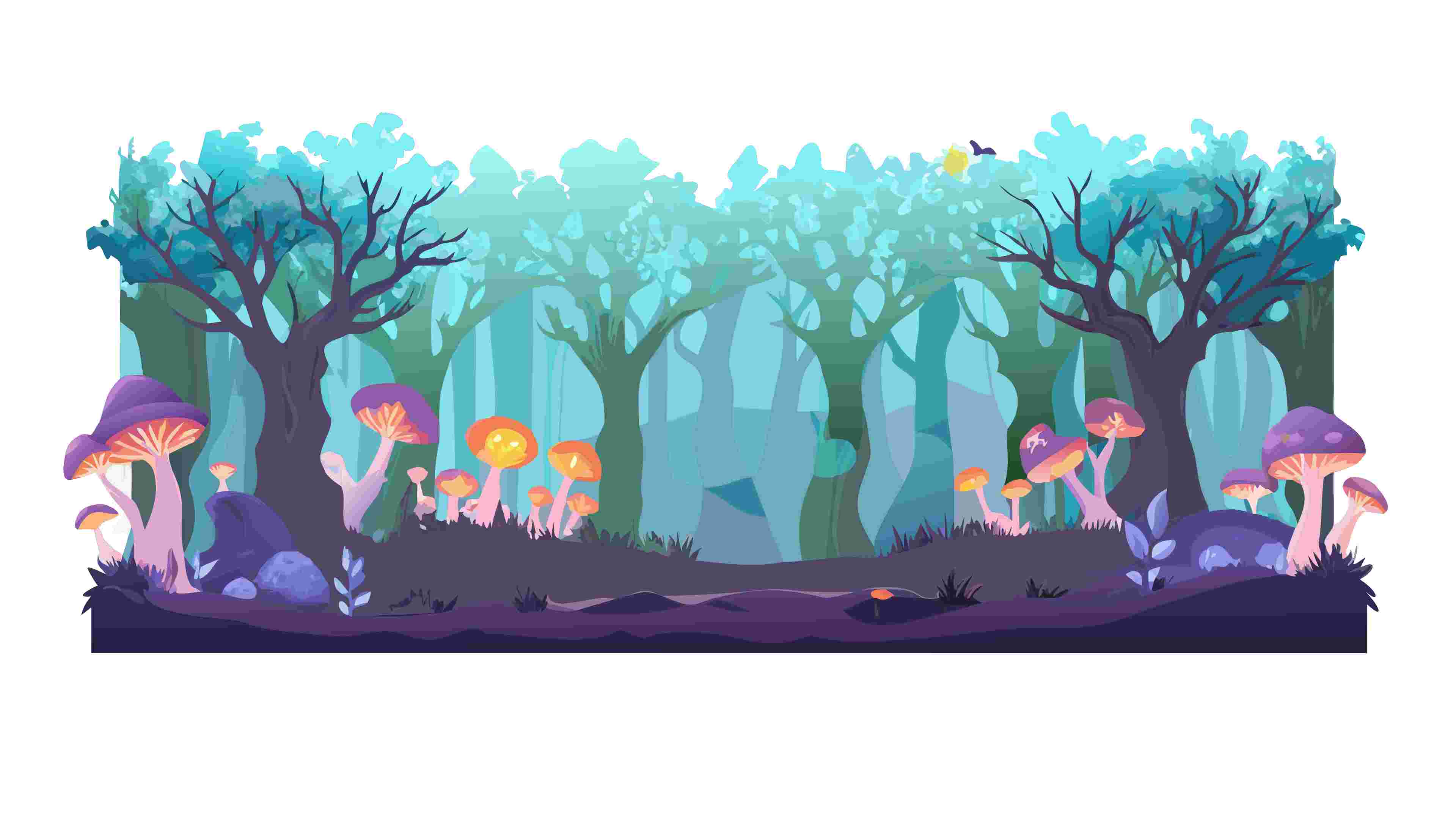 A whimsical vector illustration of an enchanted magical forest, featuring tall, ancient trees and glowing, fantastical mushrooms. This design is perfect for fairytale narratives, children's stories, game environments, or fantasy-themed projects. Its vibrant colors and mystical elements create a captivating and imaginative atmosphere, ideal for sparking wonder and creativity in visual media, vector design Generative AI.