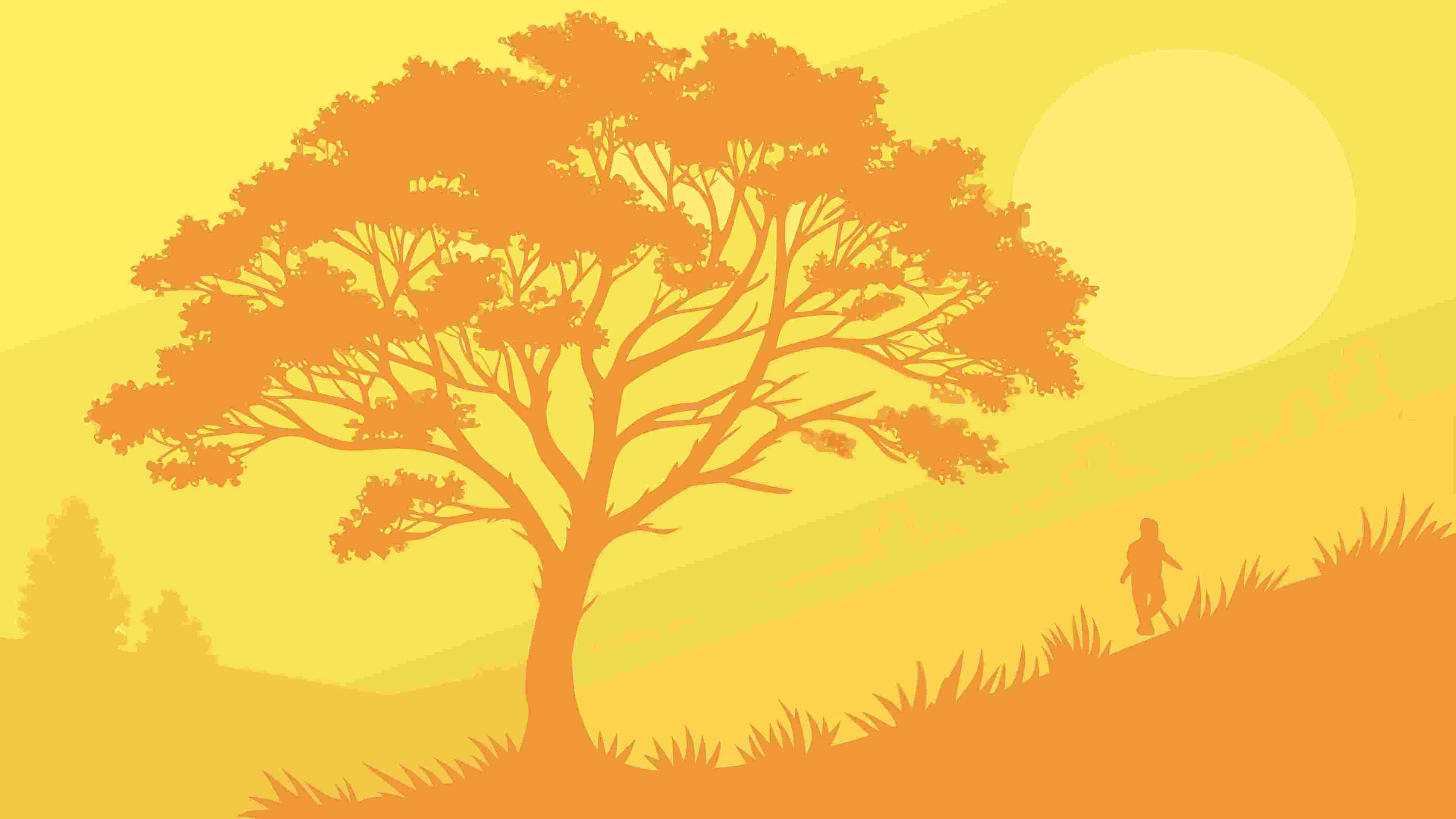 A serene golden landscape featuring a solitary, detailed tree silhouette set against a vast horizon under a warm sky. This tranquil illustration is ideal for nature-inspired designs, peaceful backgrounds, or conveying a sense of calm and natural harmony, vector design Generative AI