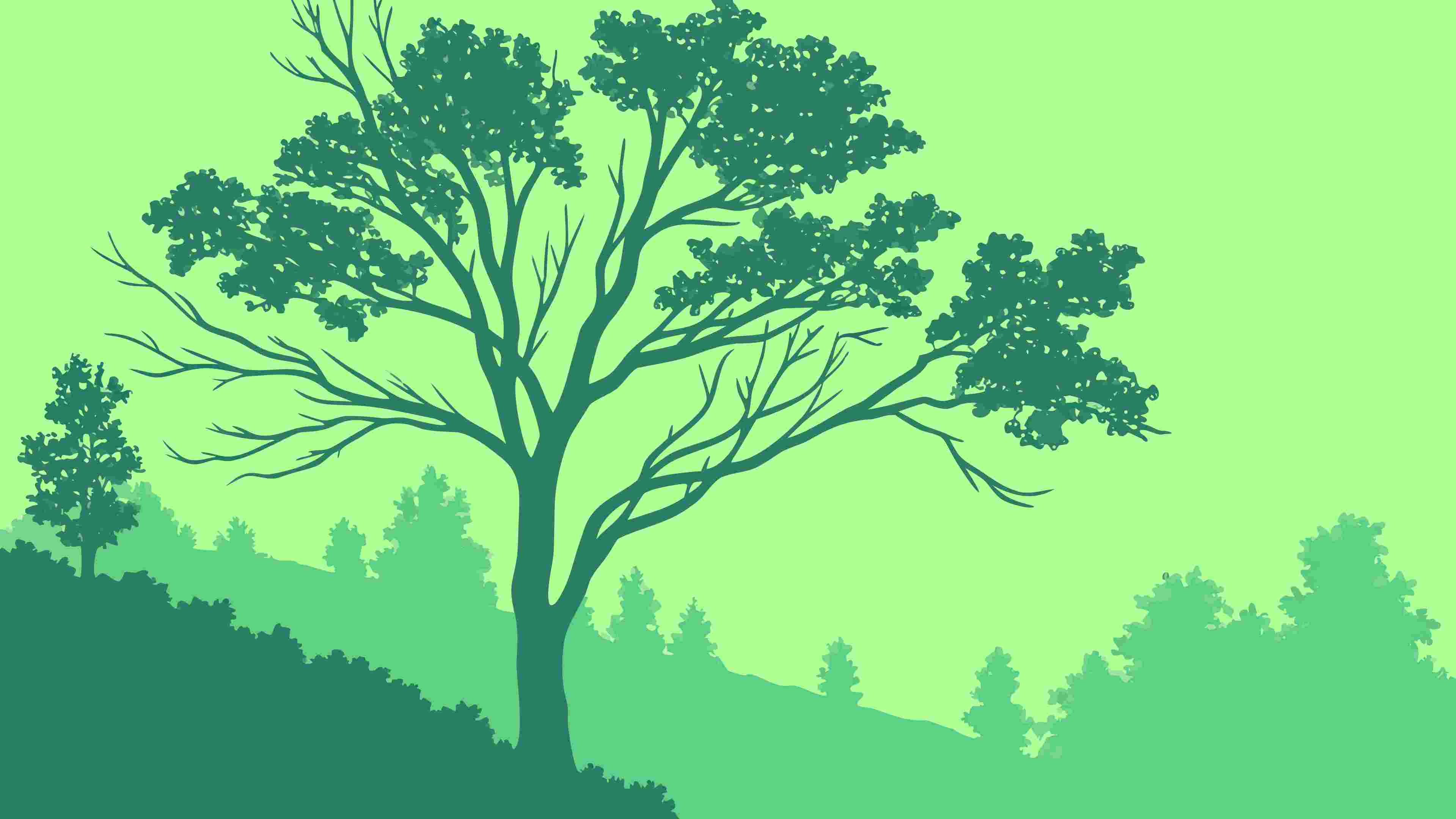 A serene forest landscape featuring the majestic silhouette of a large tree against a backdrop of deep green woods and distant hills. This illustration captures the grandeur and peace of nature, ideal for environmental projects, tranquil backgrounds, or outdoor adventure designs, vector design Generative AI