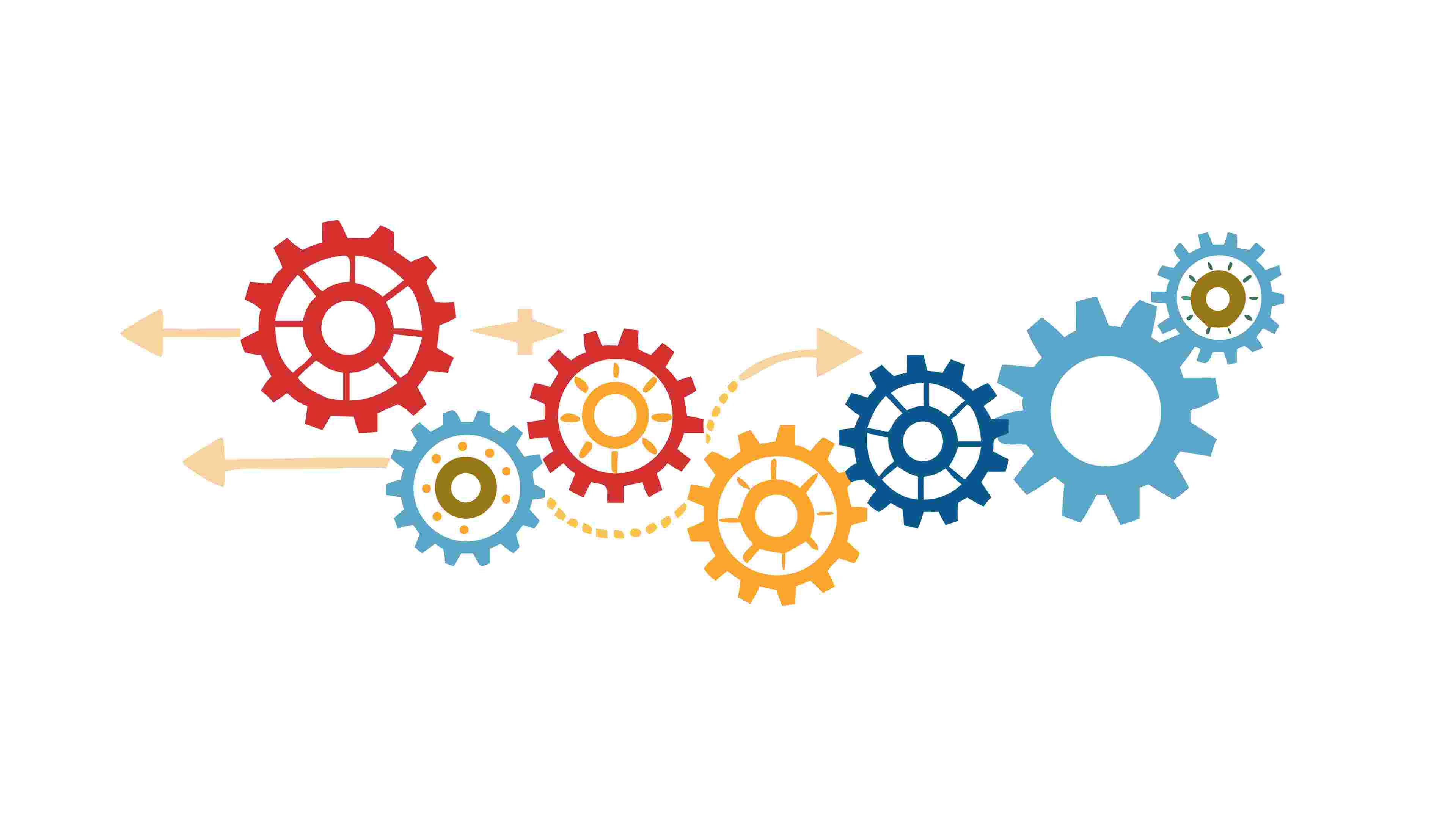 A linear arrangement of colorful, interlocking gears (orange, red, blue, yellow).jpg, illustrating a sequential process or interconnected stages. This vibrant graphic is perfect for infographics, presentations, or any design emphasizing collaboration and step-by-step development, vector design Generative AI