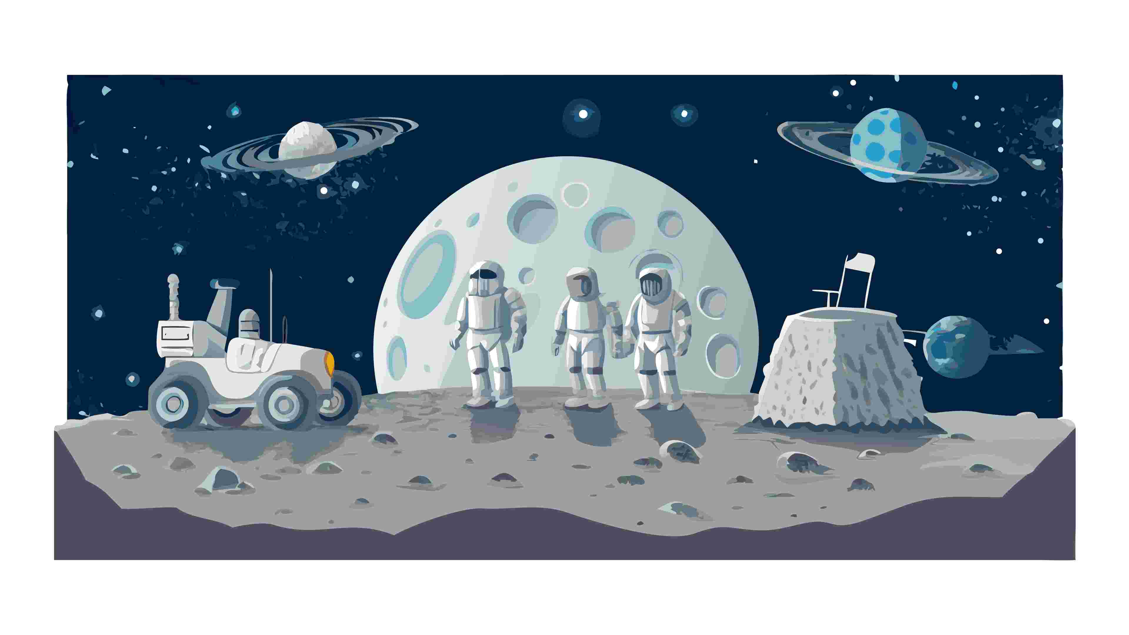 A detailed vector illustration portraying a lunar exploration mission with astronauts and a moon rover on the barren surface. Excellent for science themes, educational content, space programs, or futuristic human endeavors, emphasizing discovery, vector design Generative AI