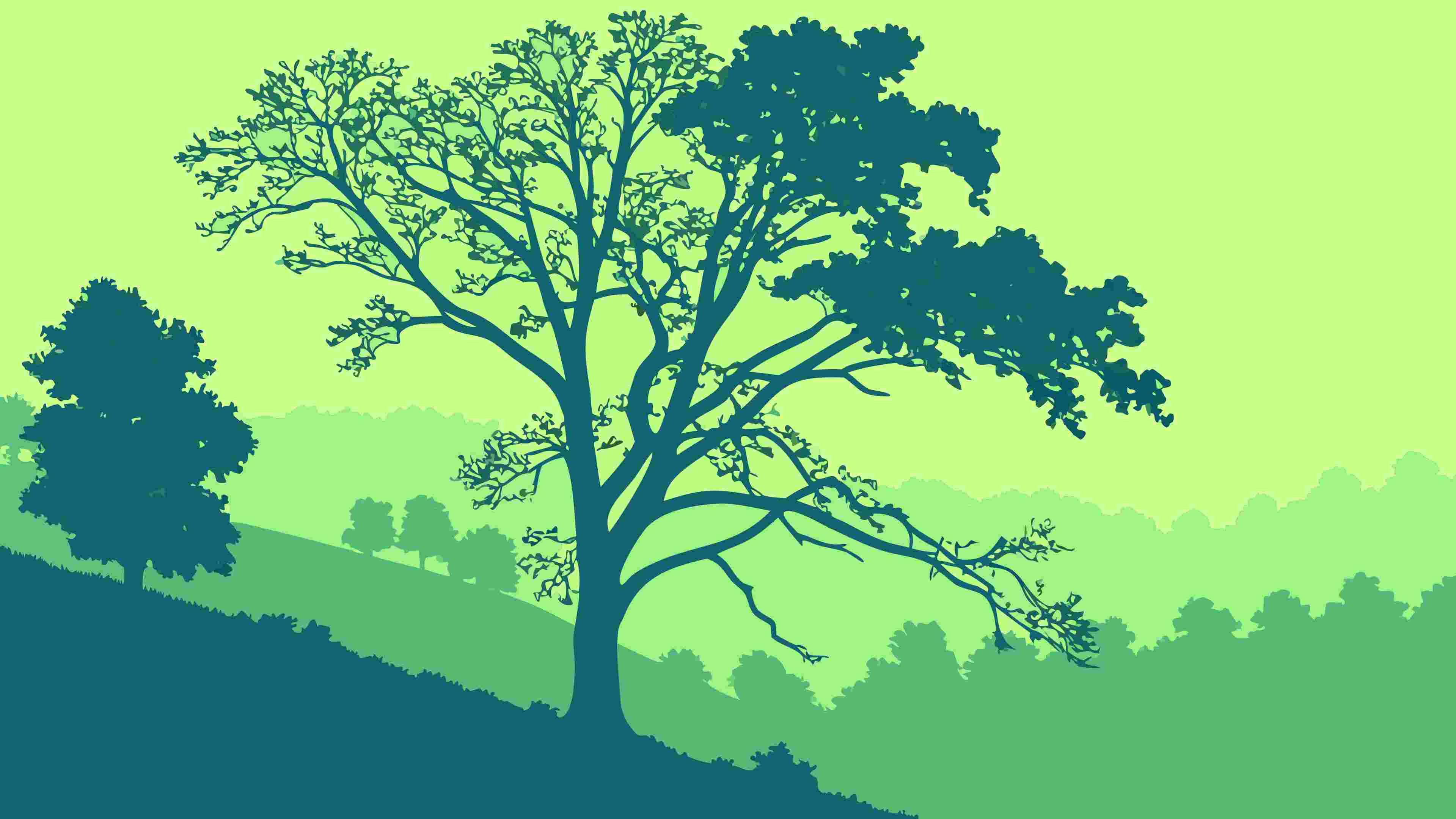 A vibrant illustration of a lush green forest landscape, highlighting a detailed tree silhouette against a backdrop of dense woods. This image exudes a sense of tranquility and natural beauty, ideal for environmental themes, serene backgrounds, or outdoor adventure designs, vector design Generative AI