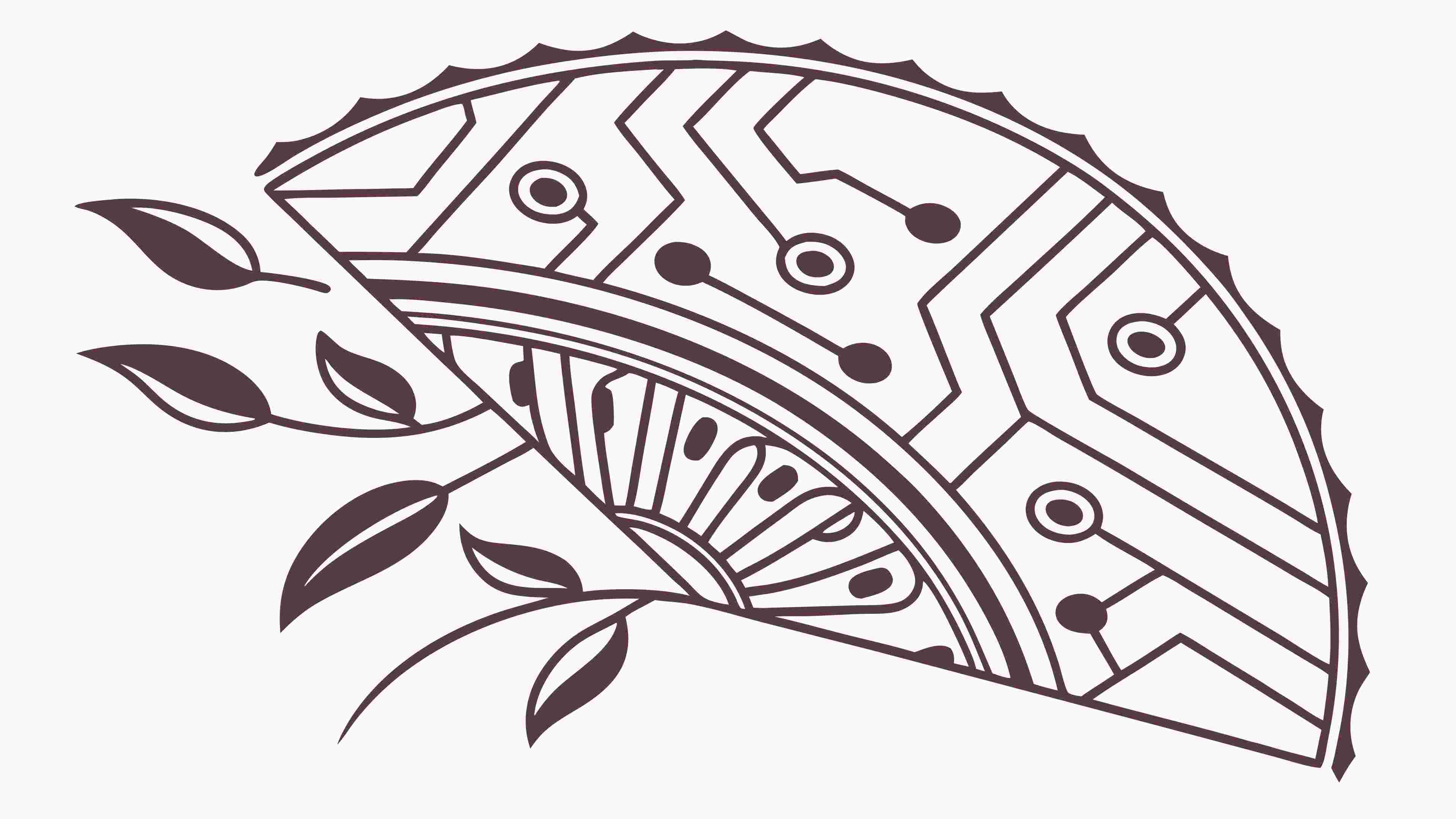 An intricate vector illustration of a decorative fan, overlaid with a circuit board pattern, blending traditional aesthetics with modern technology. This unique abstract design is ideal for cultural tech themes, artistic branding, or digital art projects, vector design Generative AI