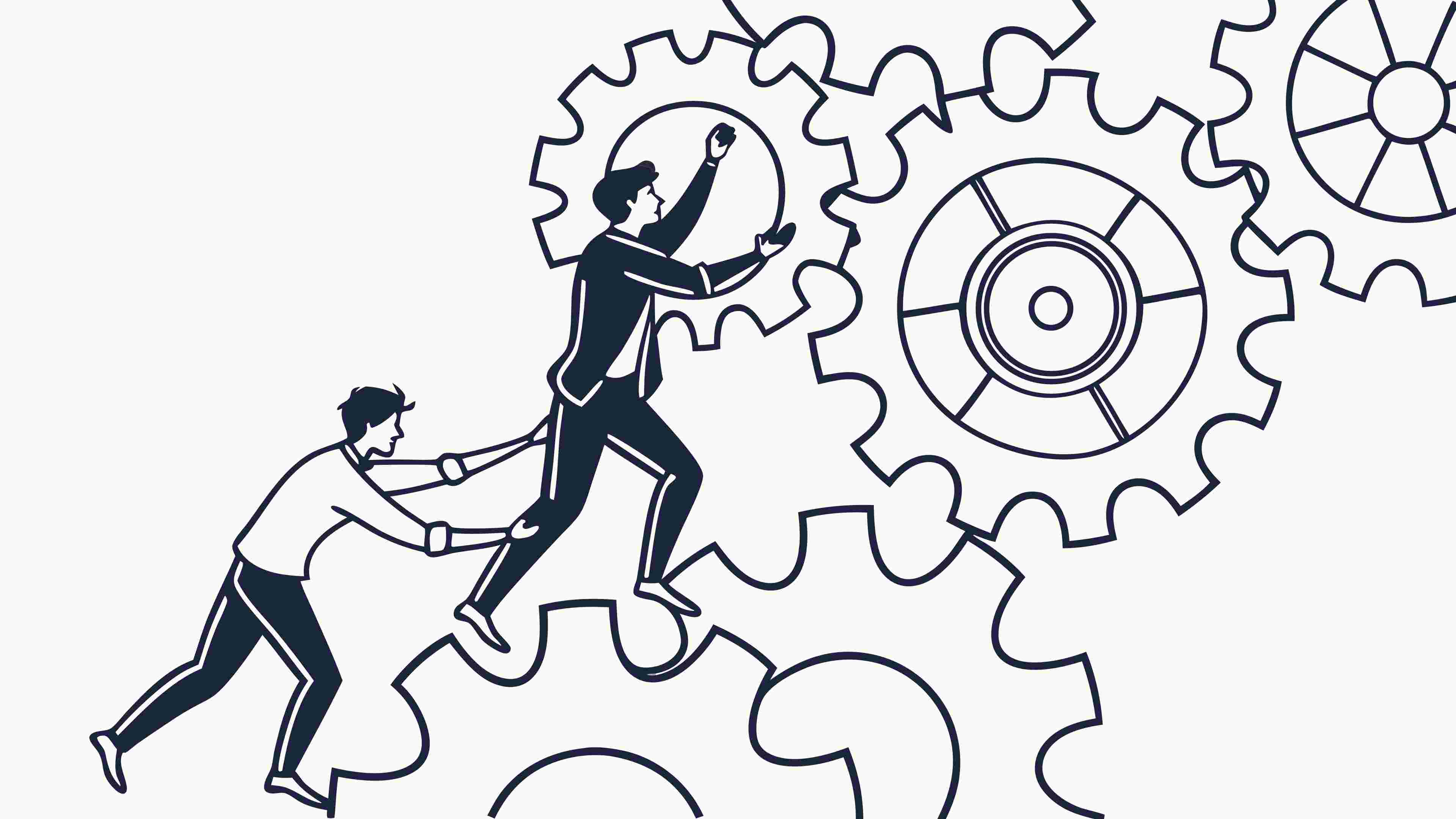 A conceptual vector illustration showing two silhouettes of people working together with large gears, one helping another. Symbolizes teamwork, progress, mechanical efficiency, or collaborative innovation, ideal for business, industrial, or developmental themes, vector design Generative AI.