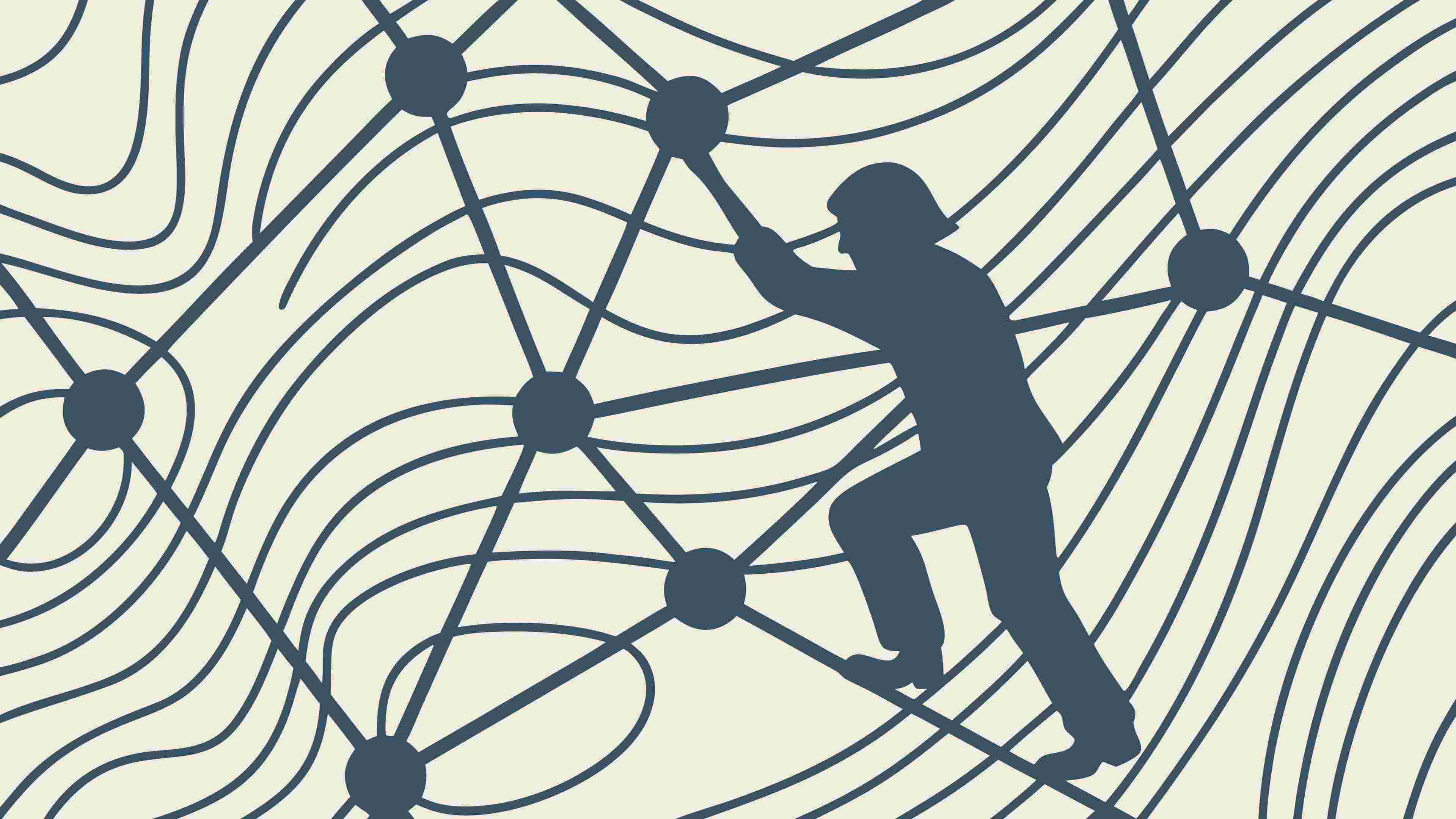 A dynamic illustration of a person climbing an abstract network grid, symbolizing progress, challenges, or navigating complex systems. This graphic is ideal for themes of personal growth, career advancement, or interaction within digital and social networks, vector design Generative AI