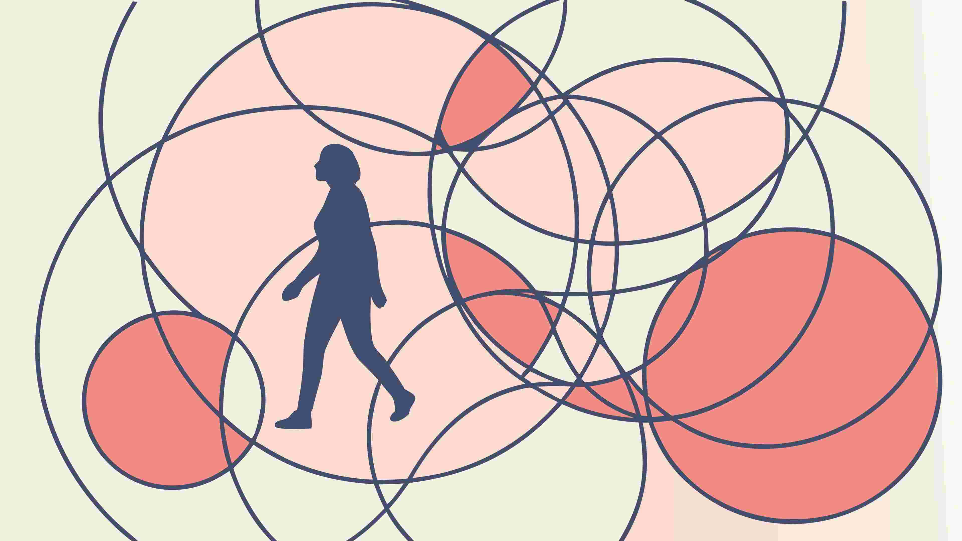 A conceptual vector illustration depicting a silhouette of a person standing amidst abstract intersecting circles and warm tones. Symbolizes connection, social networks, or navigating complex relationships, ideal for communication or abstract art themes, vector design Generative AI.