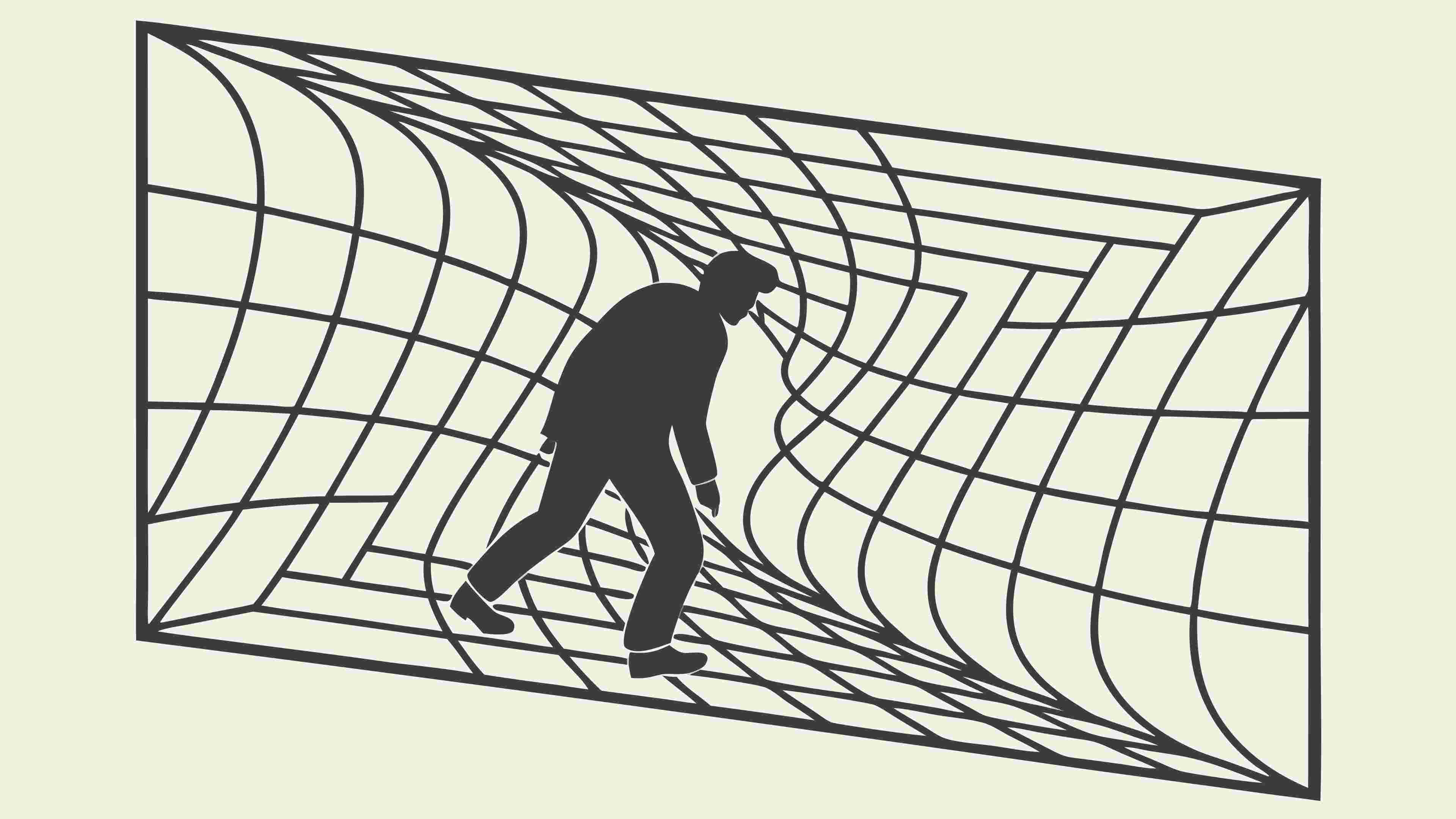 A conceptual vector illustration of a person walking through a warped, grid-like tunnel, creating a sense of distortion and depth. Symbolizes a challenging journey, unknown path, or abstract exploration, vector design Generative AI.