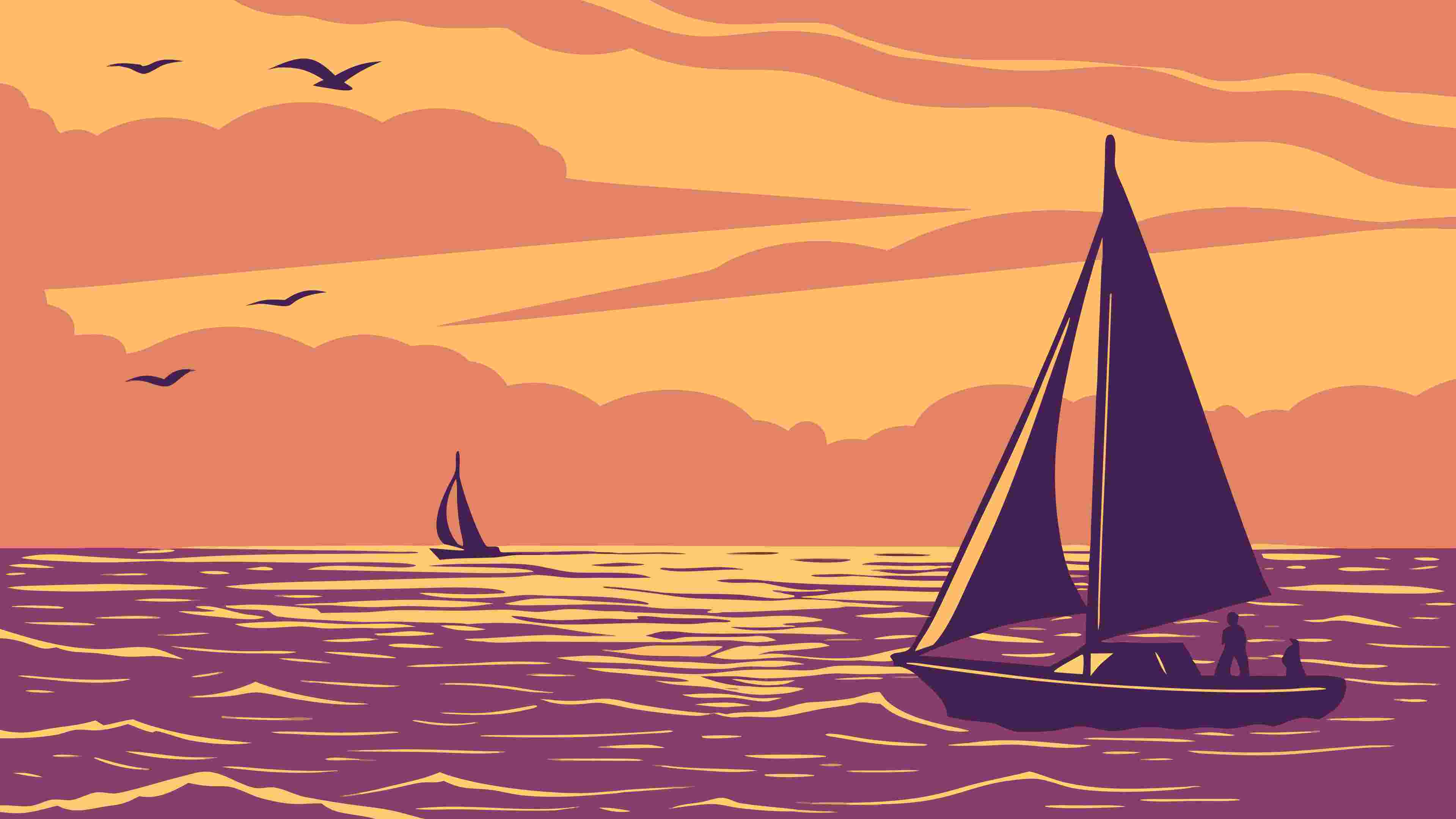 A picturesque vector illustration of sailboats leisurely cruising on the ocean at sunset, capturing the vibrant hues of the sky. This serene design is perfect for travel brochures, vacation advertisements, marine themes, or peaceful backgrounds. Its warm colors and tranquil composition evoke a sense of calm and freedom, ideal for inspiring relaxation and dreams of the open sea, vector design Generative AI.