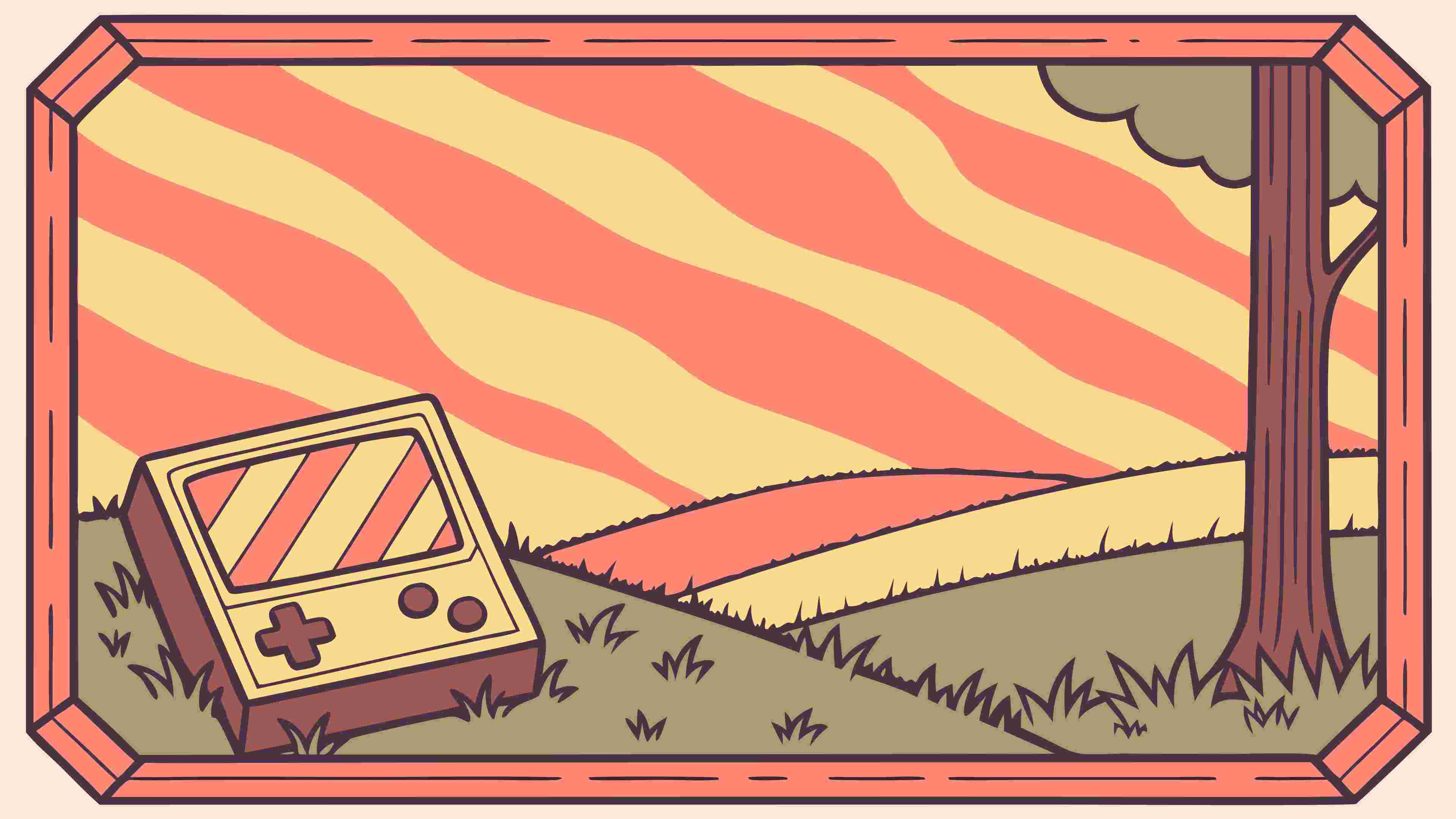 A charming vector illustration of a retro handheld game console, playfully placed within a nostalgic, stylized landscape. This graphic is perfect for gaming enthusiasts, vintage tech themes, or childhood memories. It evokes a sense of whimsical nostalgia and simple pleasures, suitable for engaging audiences with a classic and heartwarming aesthetic. vector design Generative AI