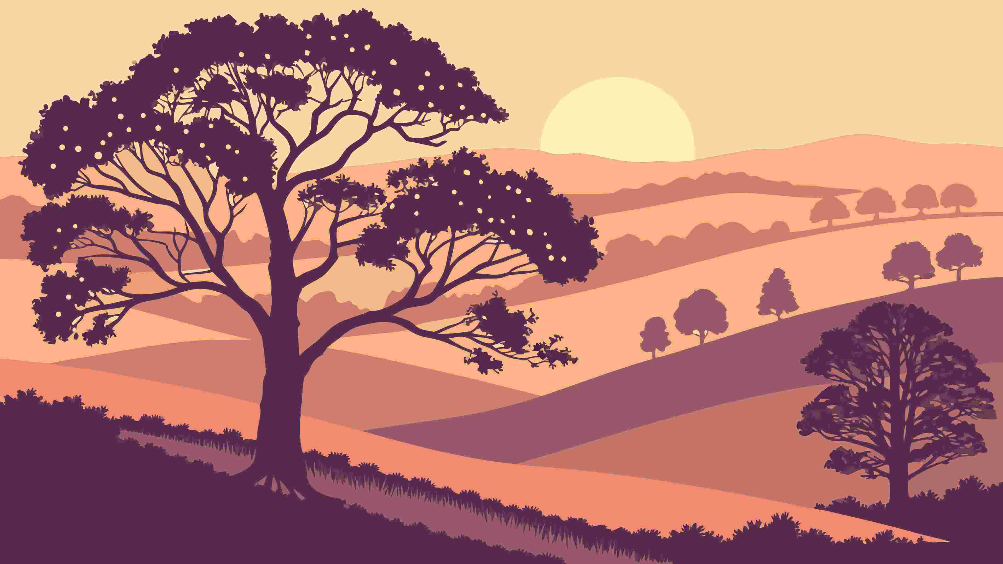 A serene vector illustration of a tranquil hillside landscape, bathed in the warm, golden glow of a sunset. This peaceful design is perfect for nature themes, calming backgrounds, environmental concepts, or travel promotions. Its harmonious colors and idyllic composition evoke a sense of calm and natural beauty, ideal for inspiring contemplative or relaxing visuals, vector design Generative AI.