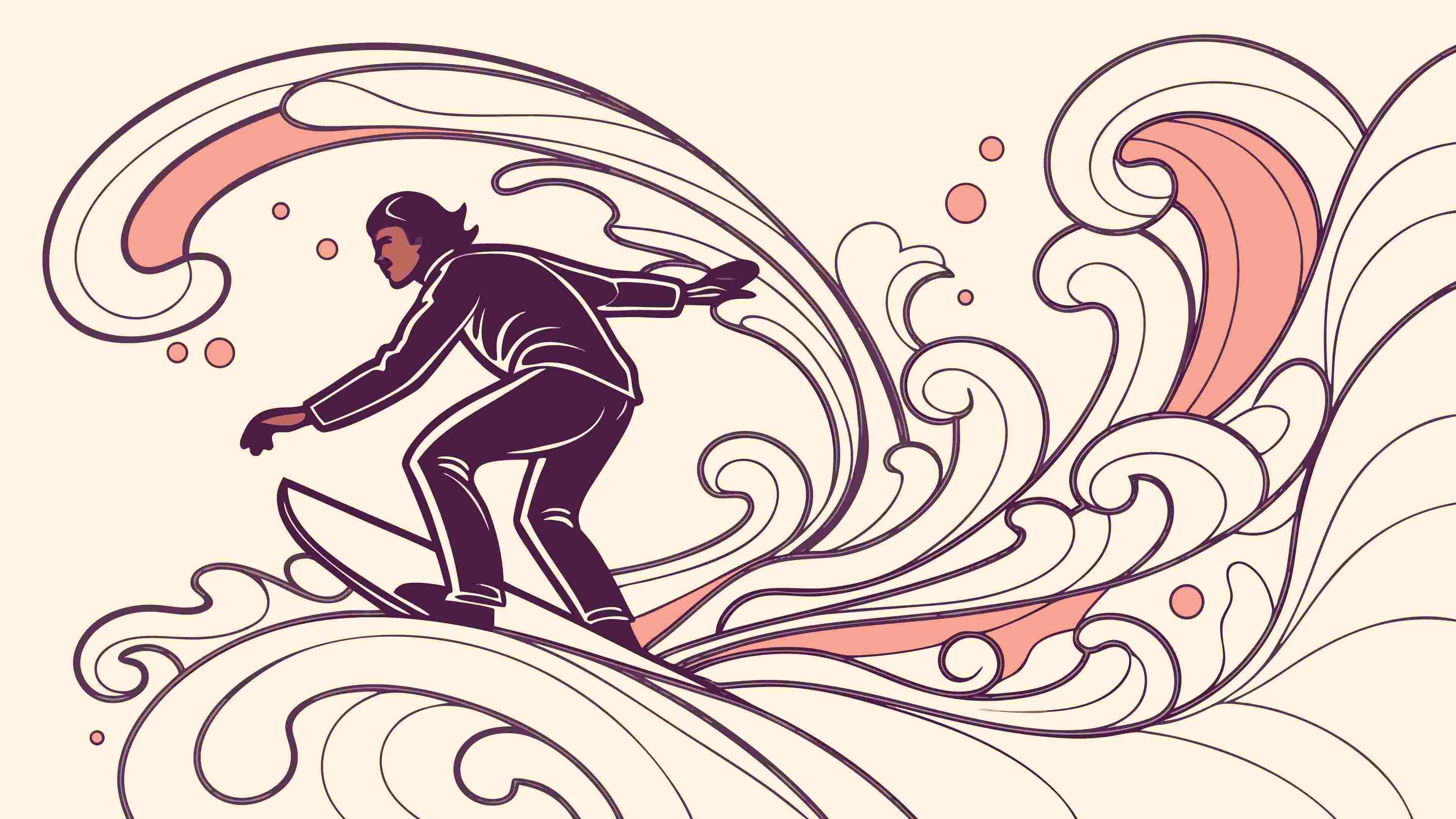 A thrilling vector illustration of a snowboarder carving through a wavy winter landscape, accented with abstract patterns. This dynamic design captures the excitement of winter sports, ideal for adventure themes, resort promotions, or expressive art, vector design Generative AI
