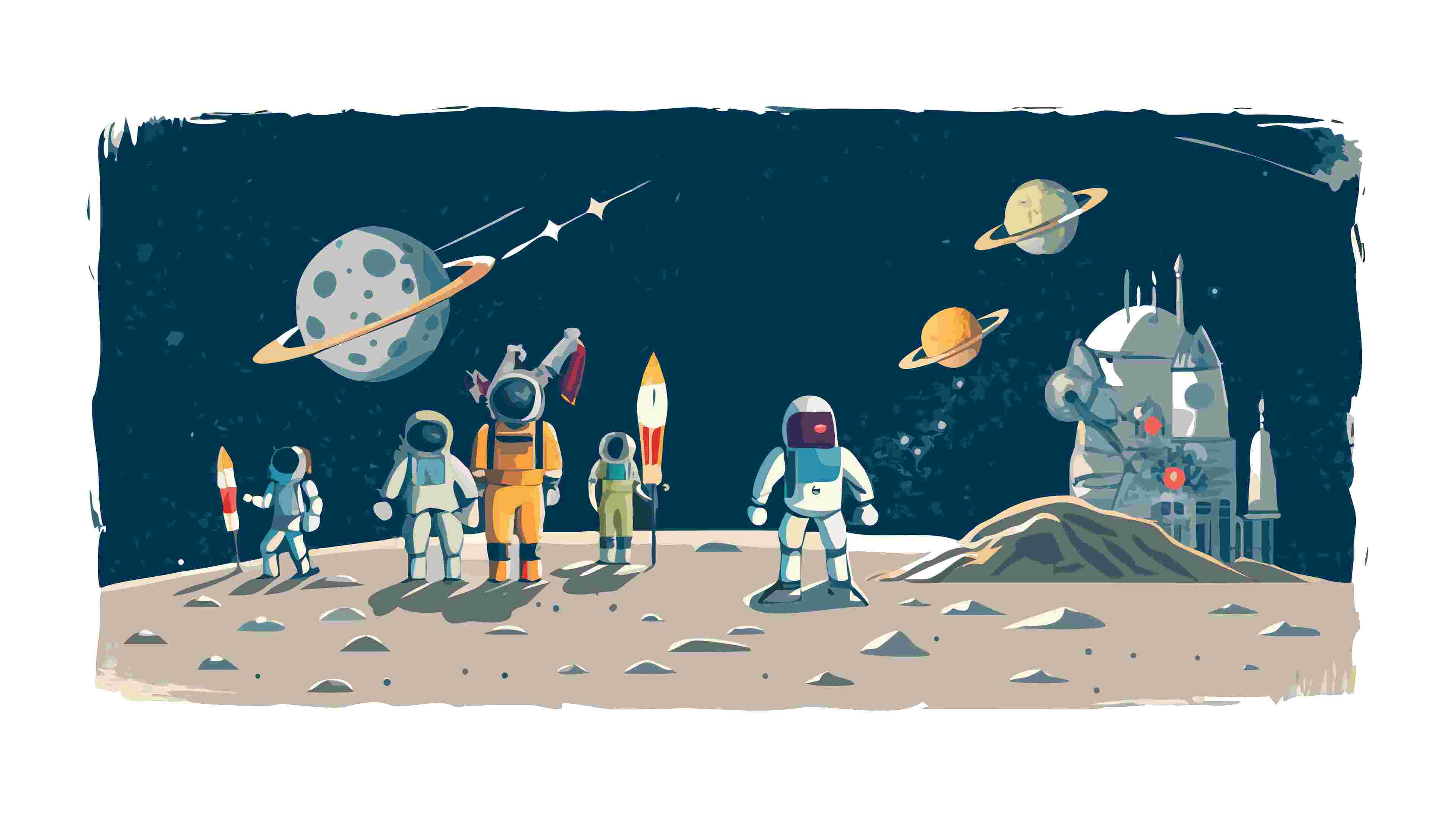 An engaging vector illustration of a space exploration team on an alien planet, complete with a rocket and unique flora. Ideal for sci-fi adventures, educational materials about space, imaginative storytelling, or futuristic travel, inspiring wonder, vector design Generative AI