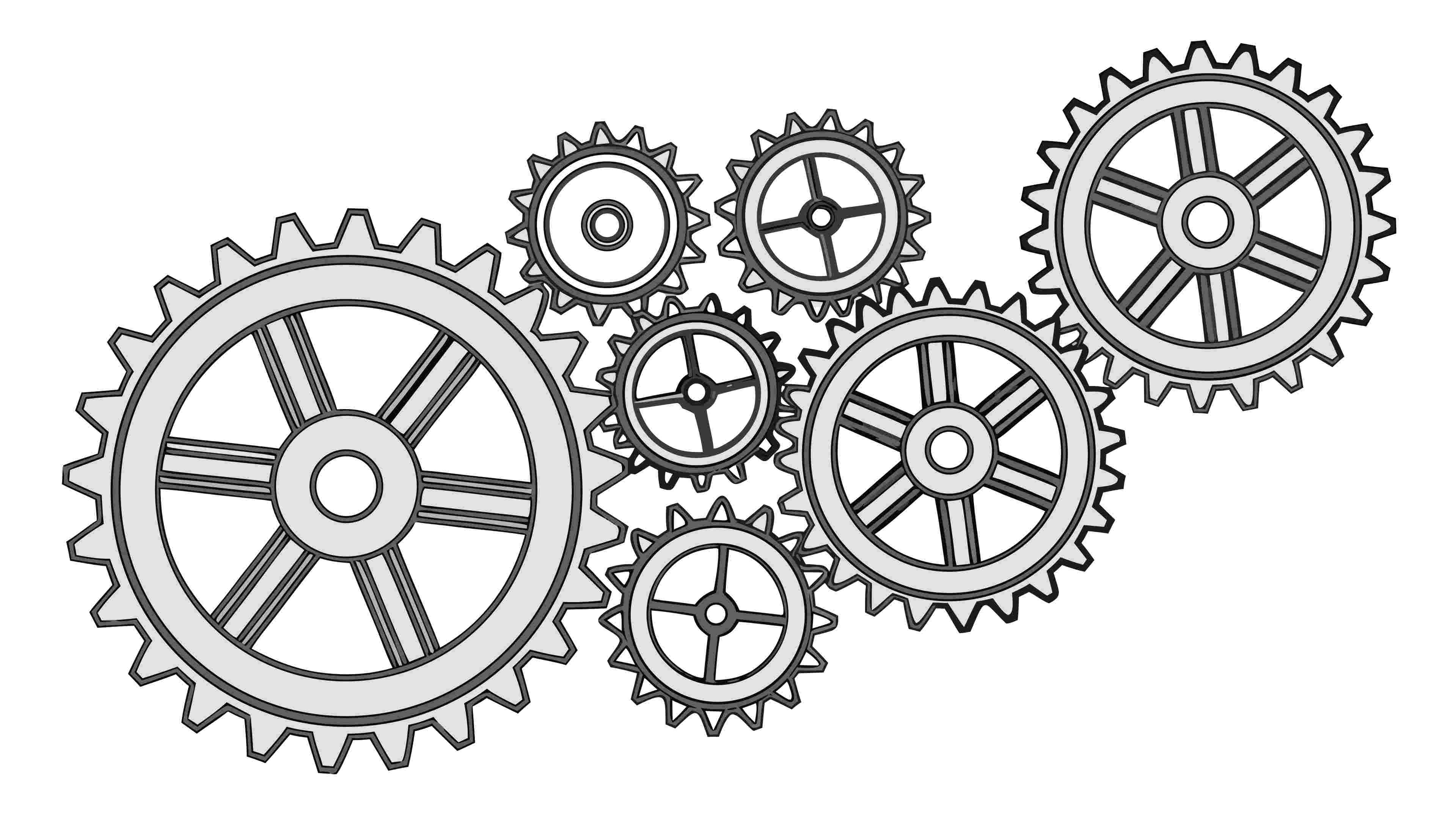 A graphic depicting multiple interlocking gears stacked and connected, forming a complex mechanical system. Rendered in dark grey tones, this illustration signifies robust engineering, precision, and the interconnectedness of various components in a functional process, vector design Generative AI