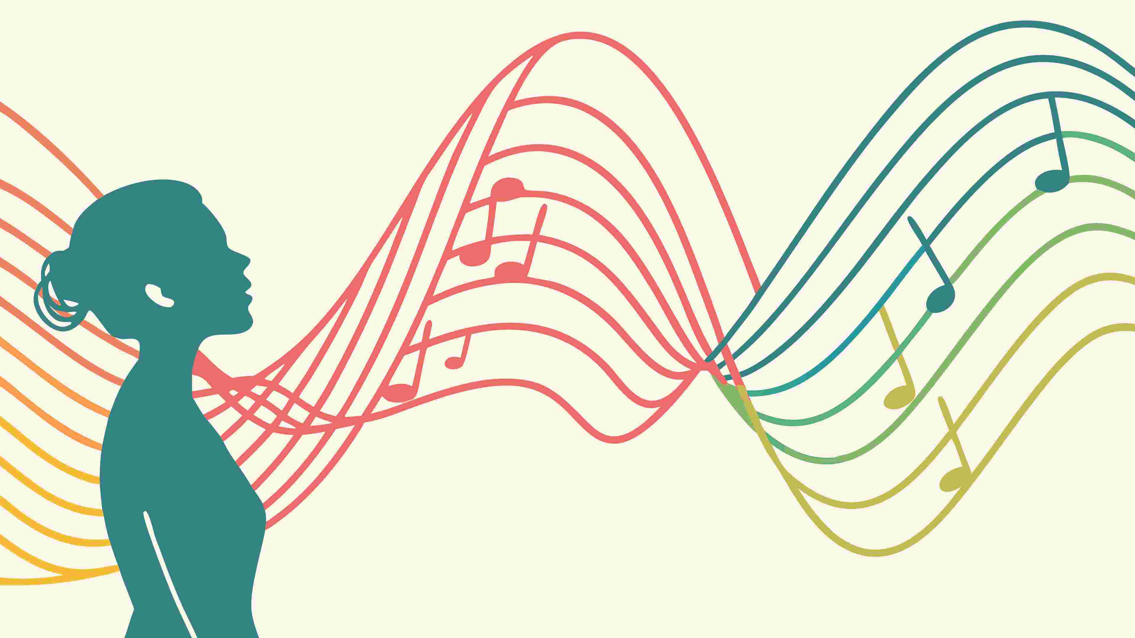 A graceful vector illustration featuring a stylized female silhouette with flowing music notes emanating from her, suggesting a singer or listener. This artistic design is perfect for vocal performance promotions, music school advertisements, digital media projects, or expressive album covers. It conveys emotion, melody, and the immersive power of music, making it ideal for projects seeking a modern and visually engaging musical aesthetic, vector design Generative AI.