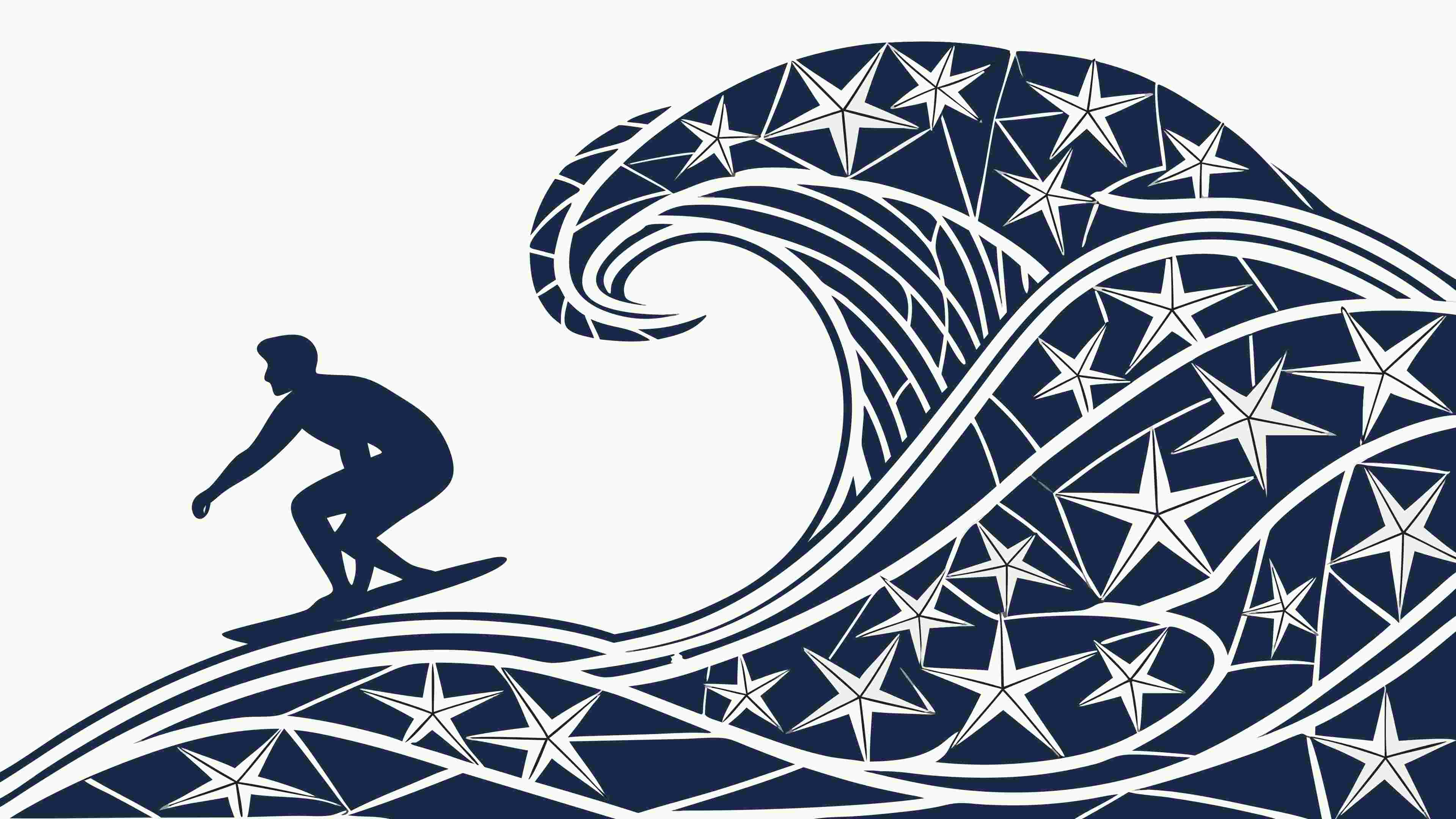 A dynamic vector illustration of a surfer expertly riding a majestic ocean wave adorned with starry patterns. Ideal for water sports, beach themes, adventure, or celestial concepts. The powerful wave and cosmic elements create a sense of awe and excitement, perfect for adventurous and imaginative graphic designs, vector design Generative AI