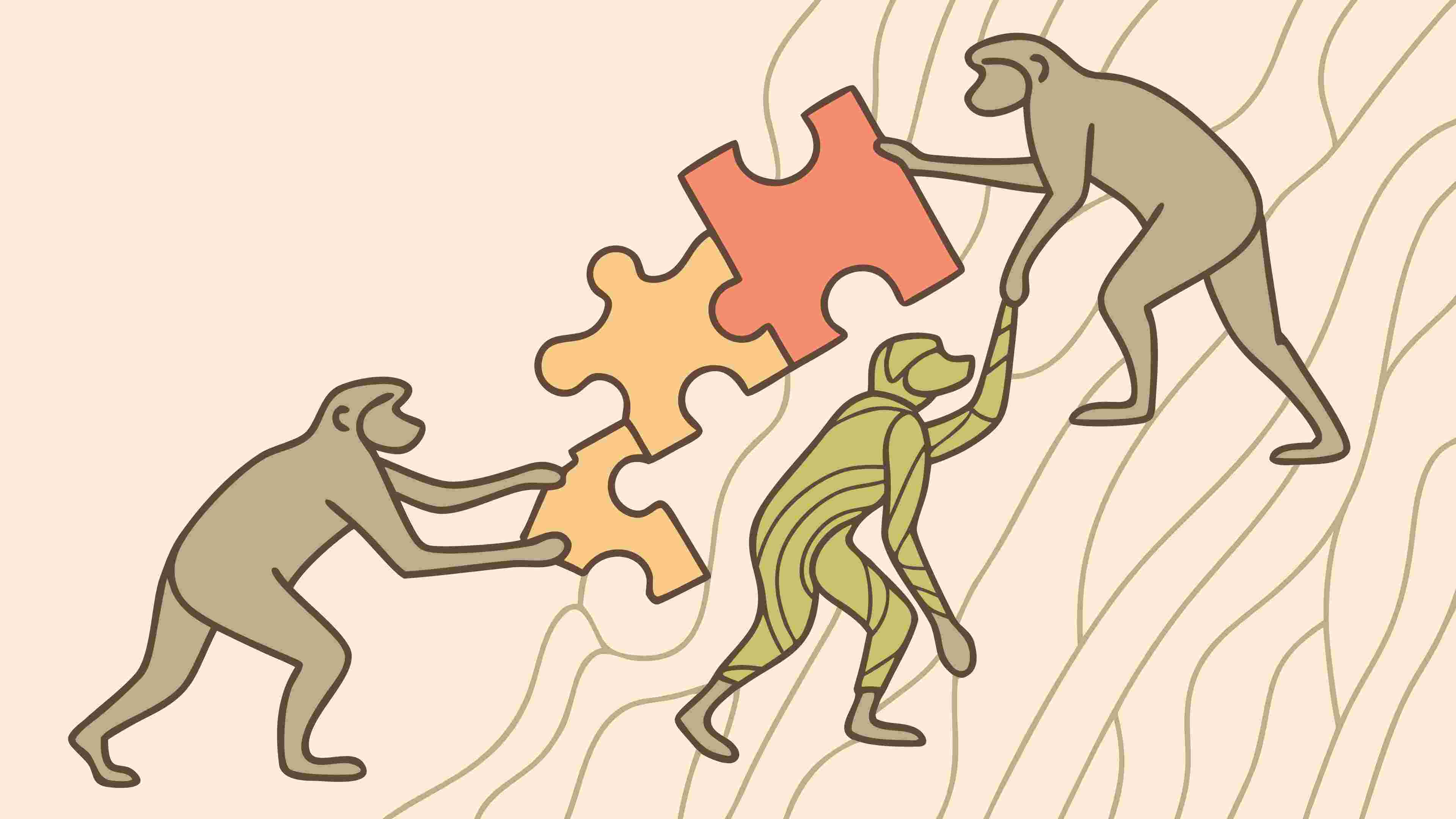 A conceptual vector illustration showing a team of three people working together to lift and connect a large puzzle piece. This image symbolizes teamwork, synergy, problem-solving, and achieving a common goal, ideal for corporate or educational presentations, vector design Generative AI