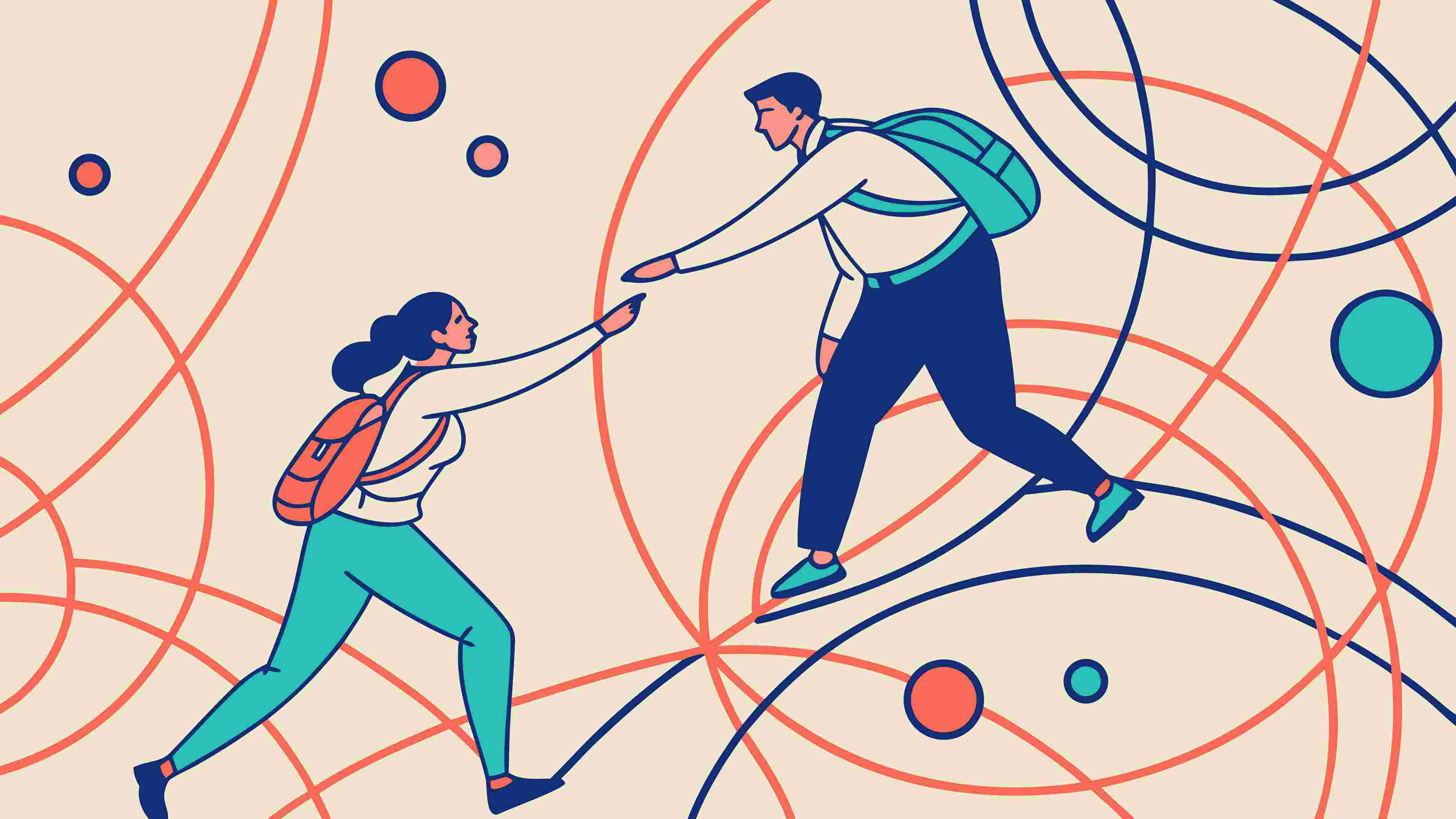 A modern vector illustration depicting two hikers ascending an abstract geometric landscape of interconnected lines and shapes. The design symbolizes teamwork, journey, and overcoming challenges, ideal for adventure, personal growth, or collaborative themes, vector design Generative AI