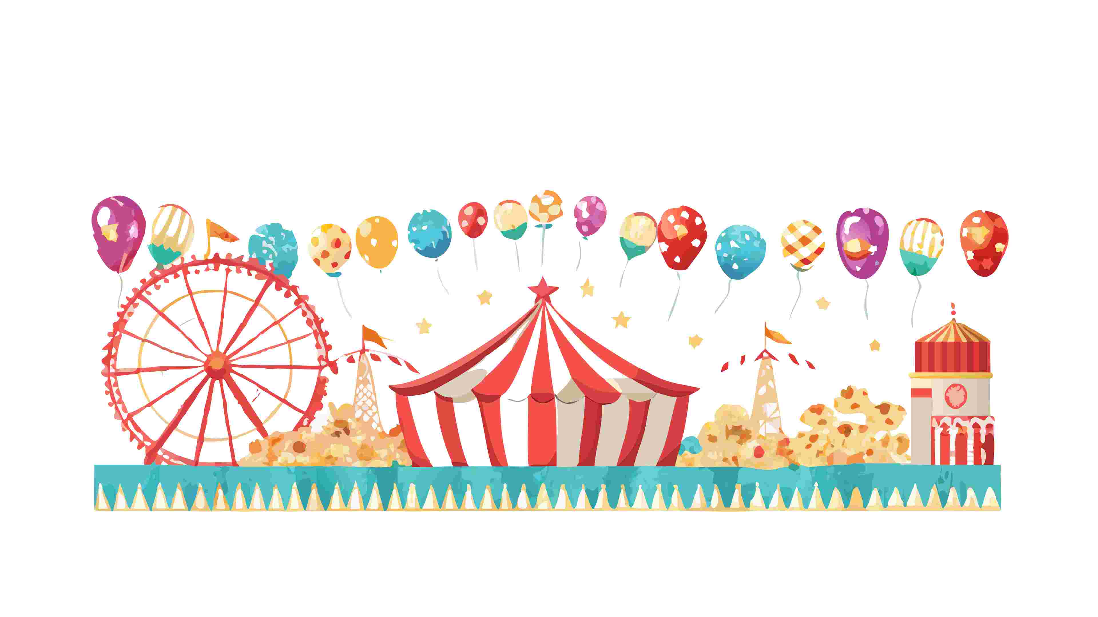 An eye-catching vector landscape depicting a vibrant carnival scene. Highlighted by large red and white striped big top tents, playful flags, and a Ferris wheel, creating an exciting backdrop. Suitable for posters, event banners, and children's book illustrations, vector design Generative AI