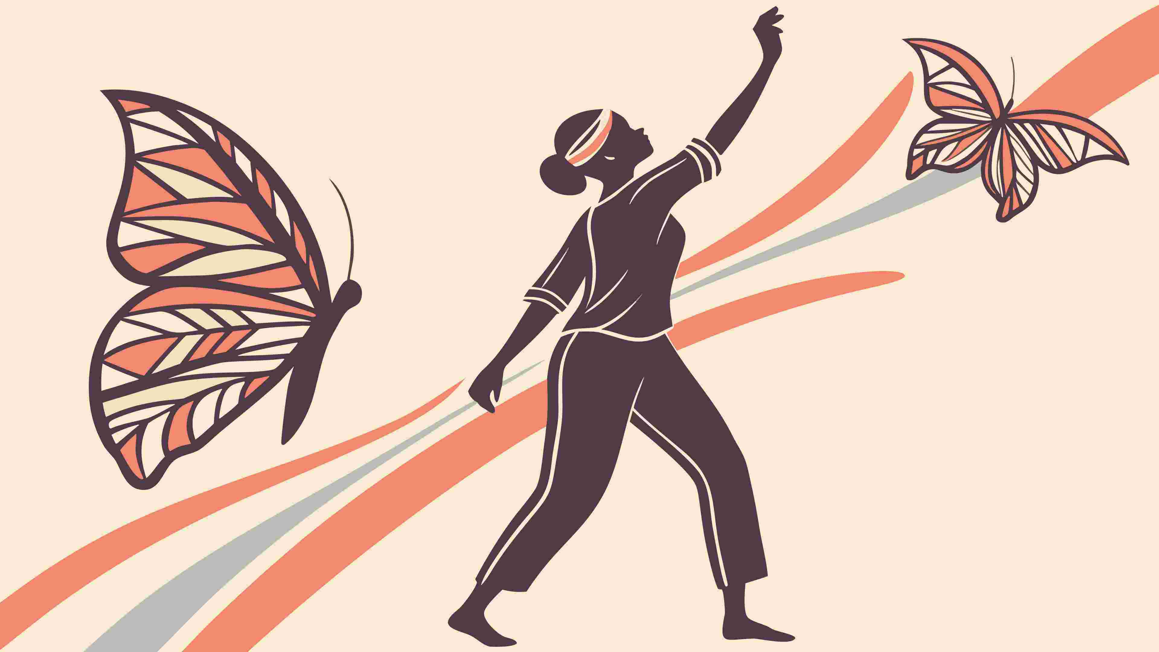 A graceful vector illustration of a woman reaching towards flying butterflies, surrounded by elegant, flowing abstract lines. Symbolizes hope, aspirations, freedom, and beauty, suitable for inspirational, nature, or personal growth themed designs, vector design Generative AI.